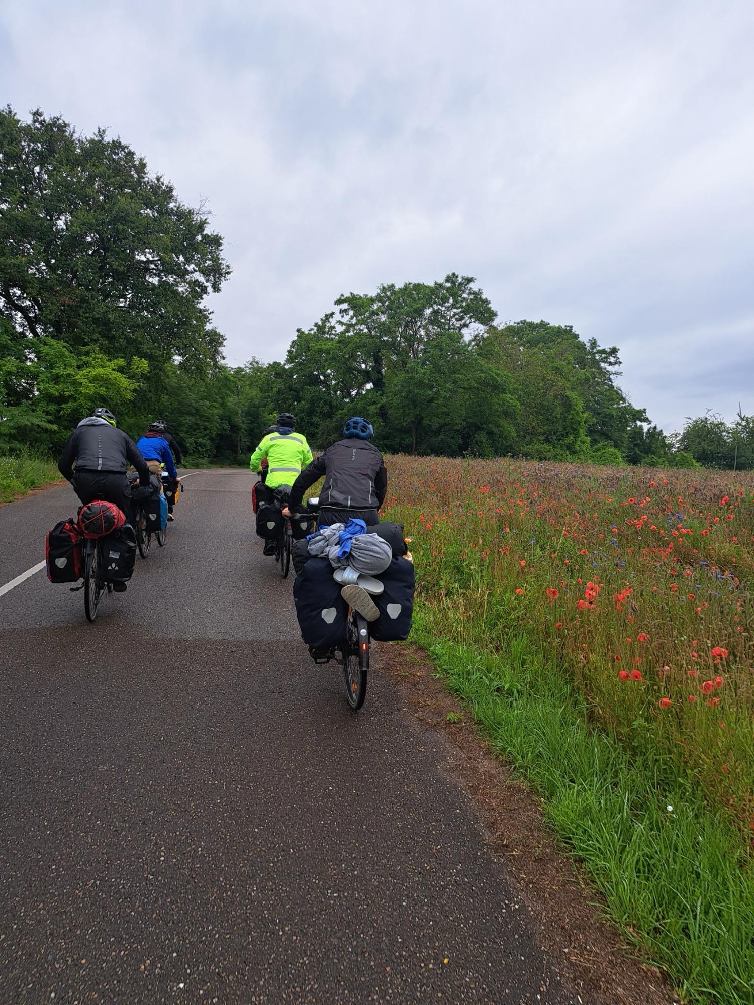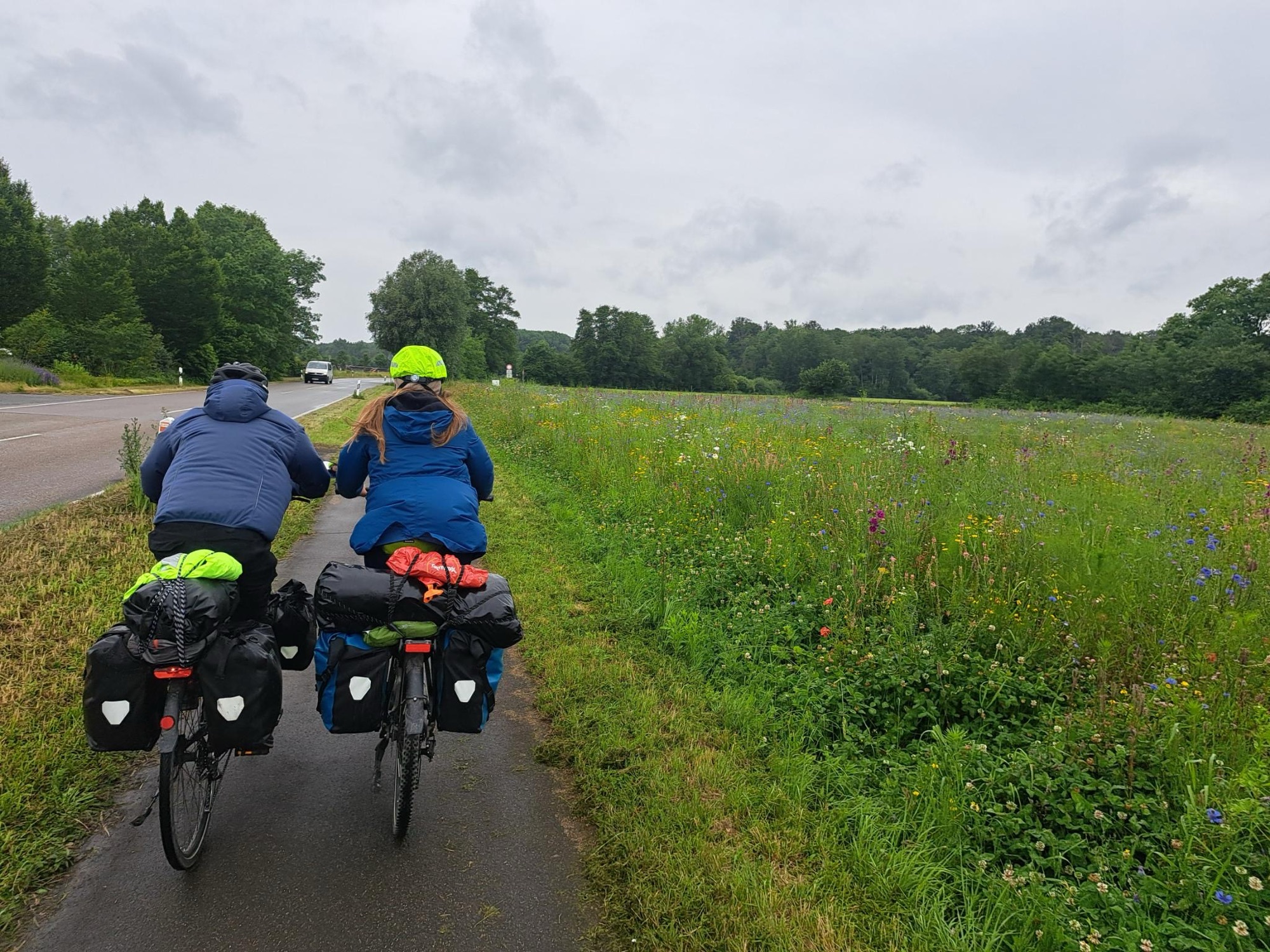 Nach einiger Zeit verließ er uns und wurde von Pia-Pedale abgelöst. Sie führte uns zu dem Punkt, dem wir alle entgegen gefiebert haben, der französischen Grenze. Nachdem an Passanten die wenigen französisch Kenntnisse ausprobiert wurden, gelangten wir nach wenigen Kilometern an den Campingplatz, wo der Tag mit Nudeln und dem ersten EM-Spiel erfolgreich abgeschlossen wurde.