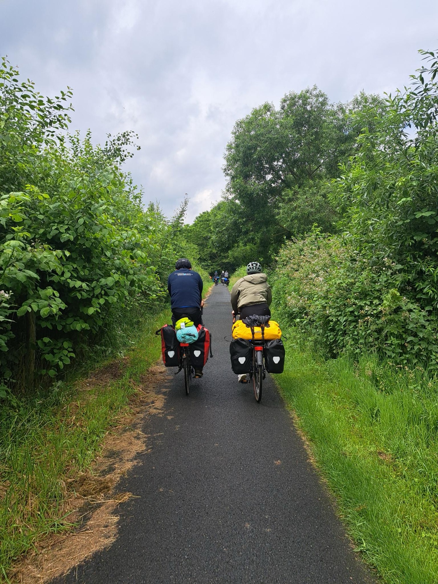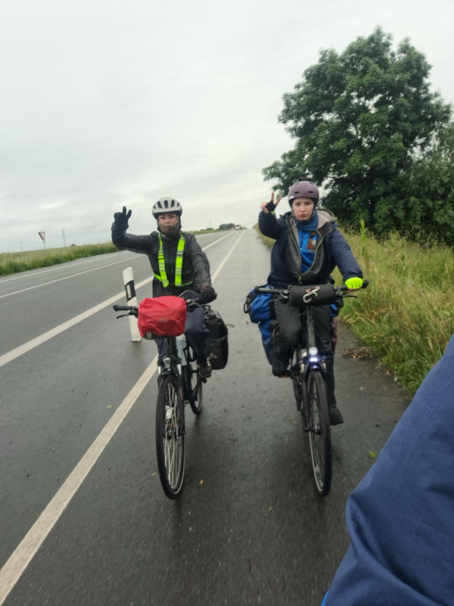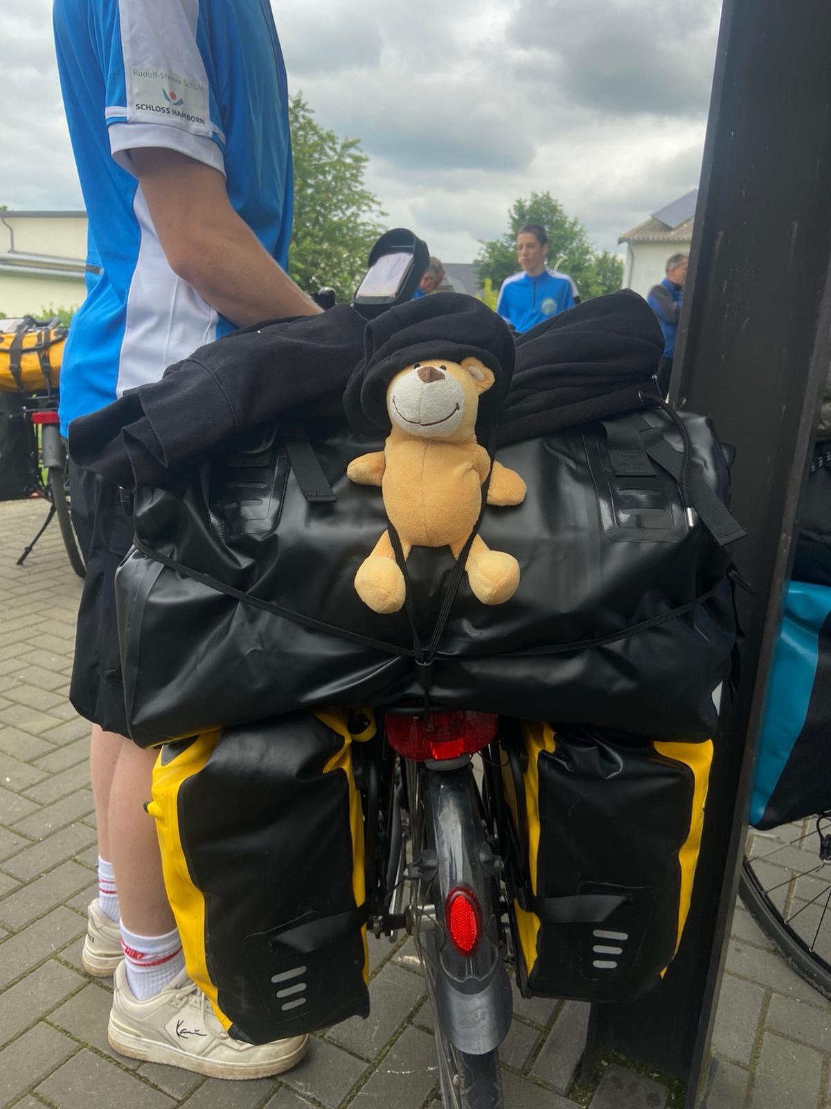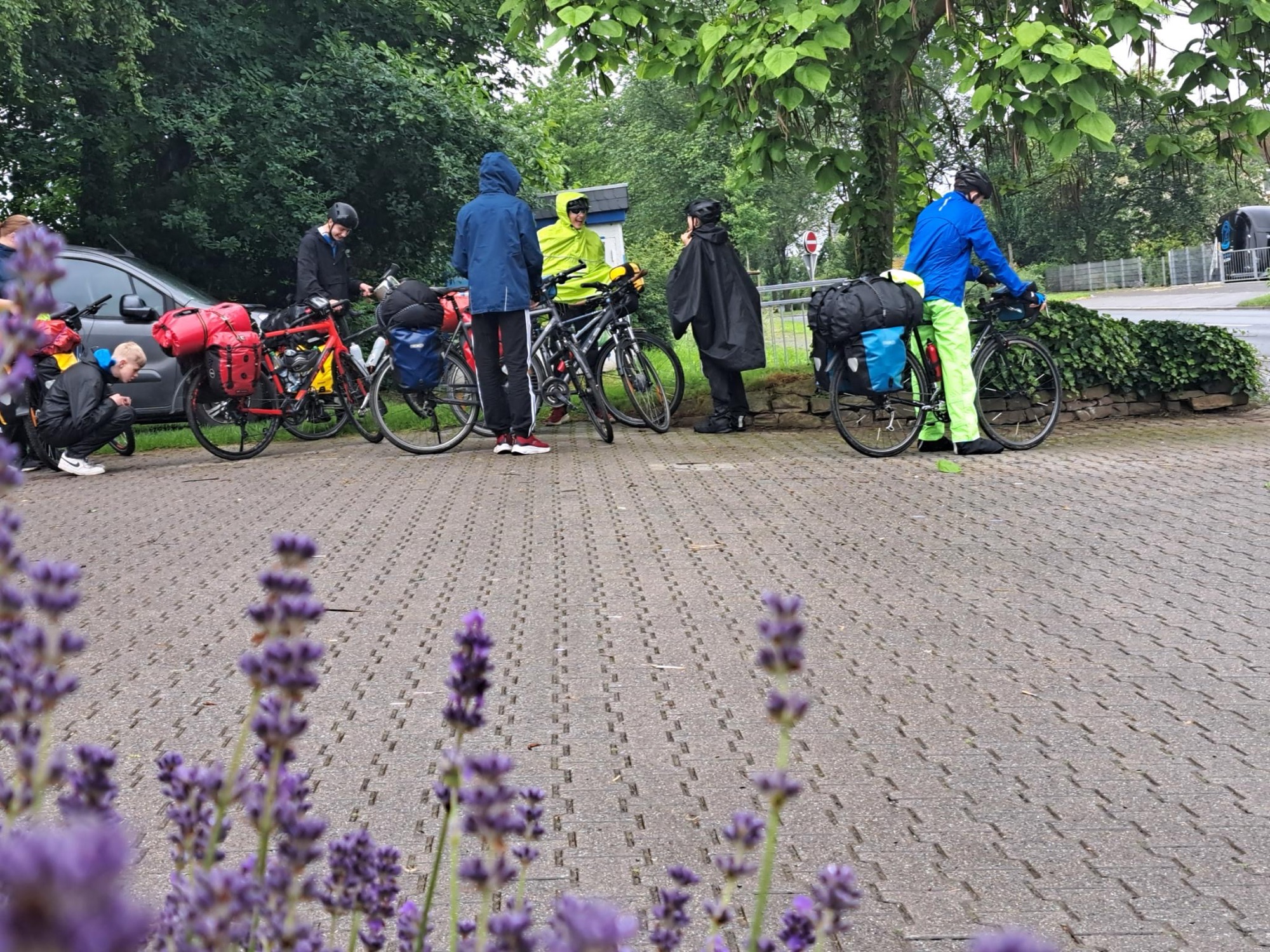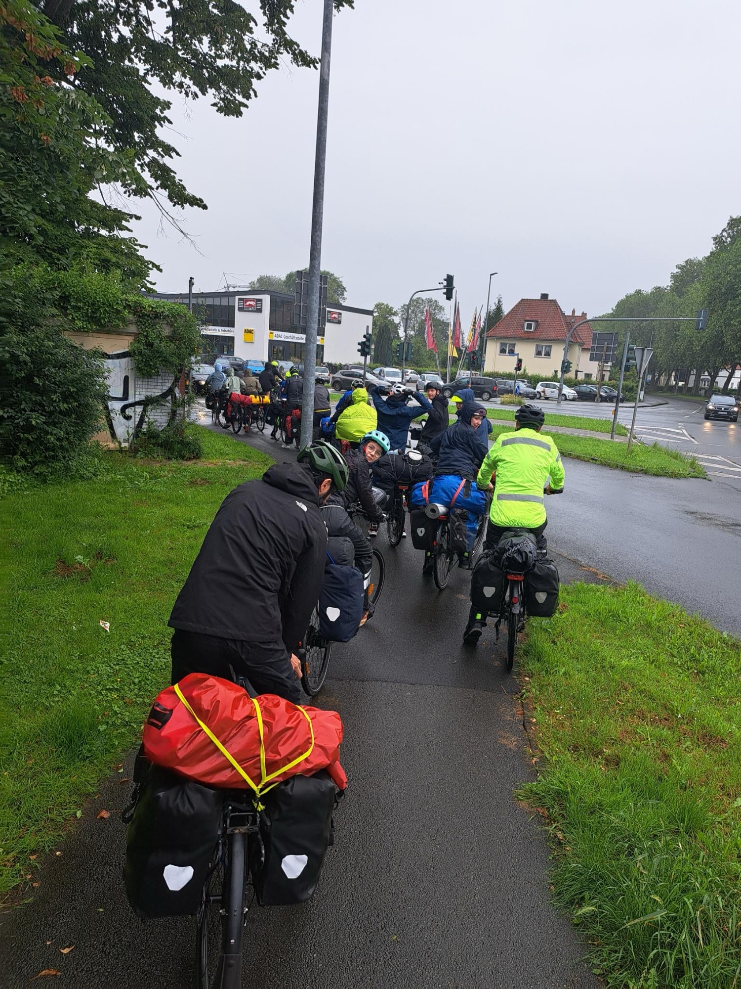 Als heute morgen alle nach und nach in der Sporthalle der Waldorfschule Soest aufwachten prasselte der Regen leicht auf die Dachfenster. Bei einem für uns vorbereiteten Frühstücksbuffet von zwei Kolleginnen der Waldorfschule stärkten wir uns für die bevorstehende Tour. Nun hieß es Regenkleidung an und ab aufs Fahrrad. Heute fuhren wir überwiegend durch kleinere Städte oder Dörfer und an Bundesstraßen entlang.
