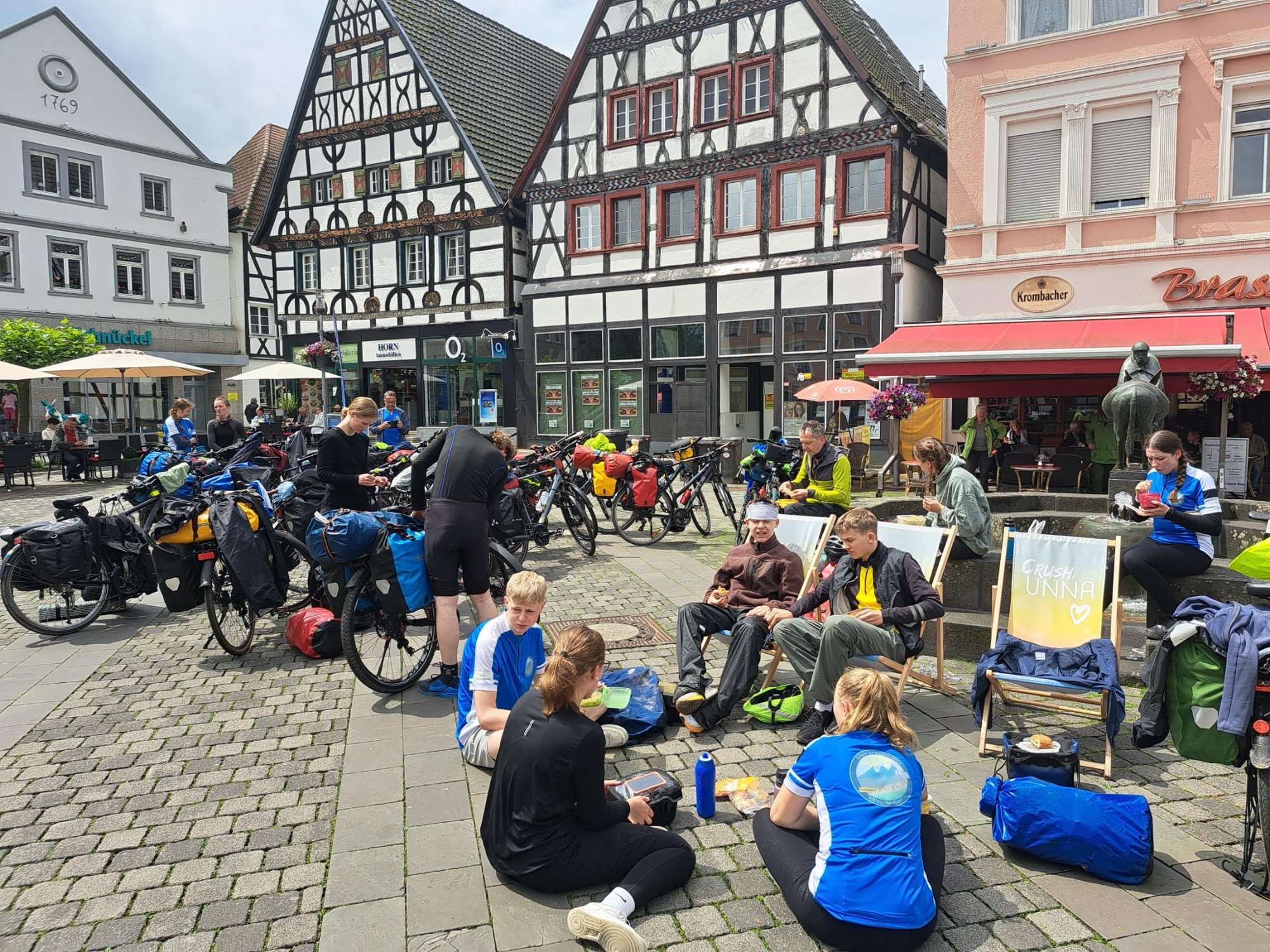 Unseren ersten Stopp machten wir nach ca. 30 km in Unna auf dem Marktplatz. Gut gestärkt ging es dann weiter auf einen sehr anstrengenden Streckenabschnitt. Wir fuhren mitten durch Dortmund über riesige Kreuzungen und große, viel befahrene Straßen. Den ein oder anderen Anstieg galt es ebenfalls zu erklimmen. Es galt die Ruhe zu bewahren und als Kolonne zusammenzuhalten. Unsere Rettung war ein Supermarkt, in dem wir Zutaten für unser erstes, selbst gemachtes Abendbrot kauften.