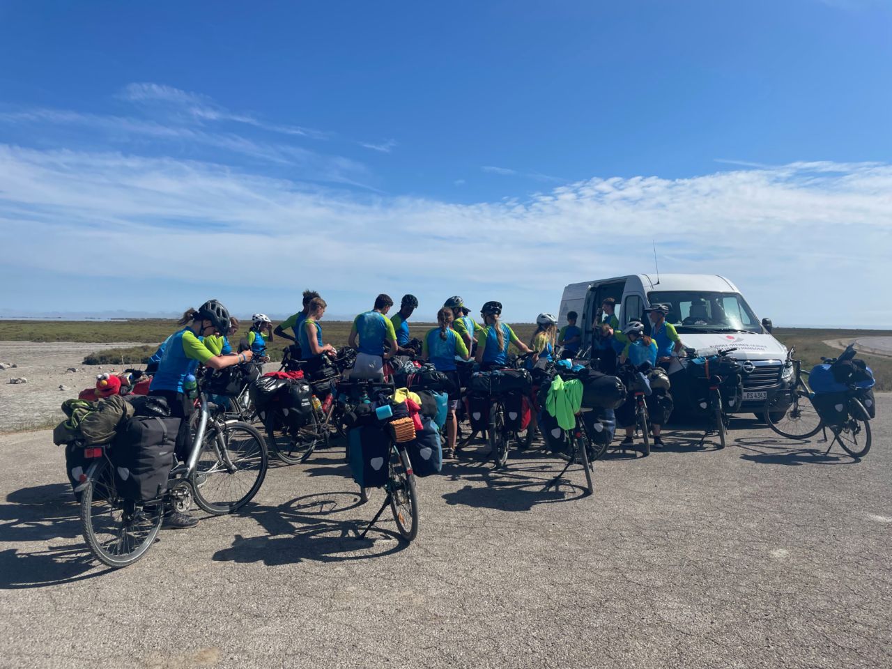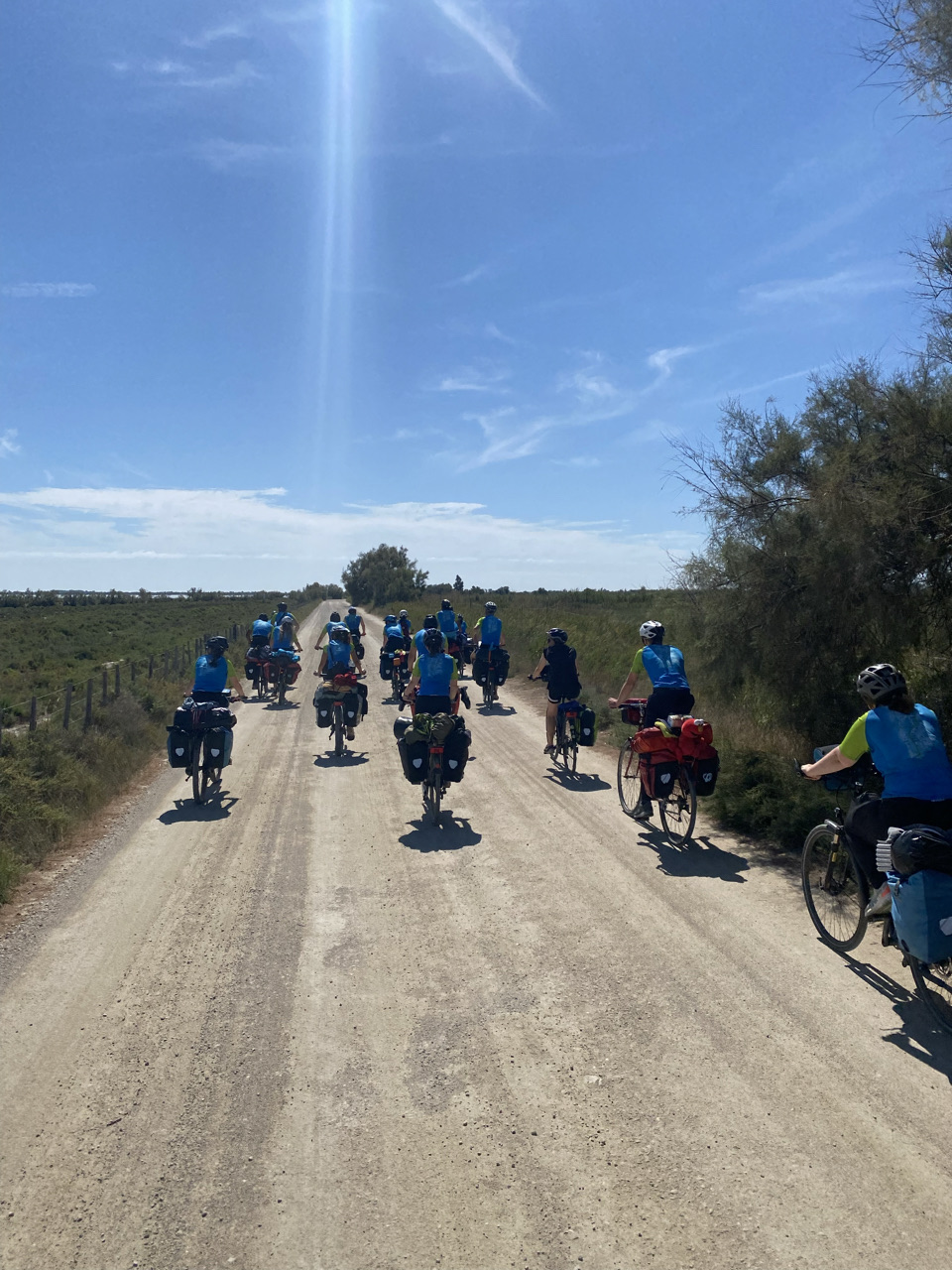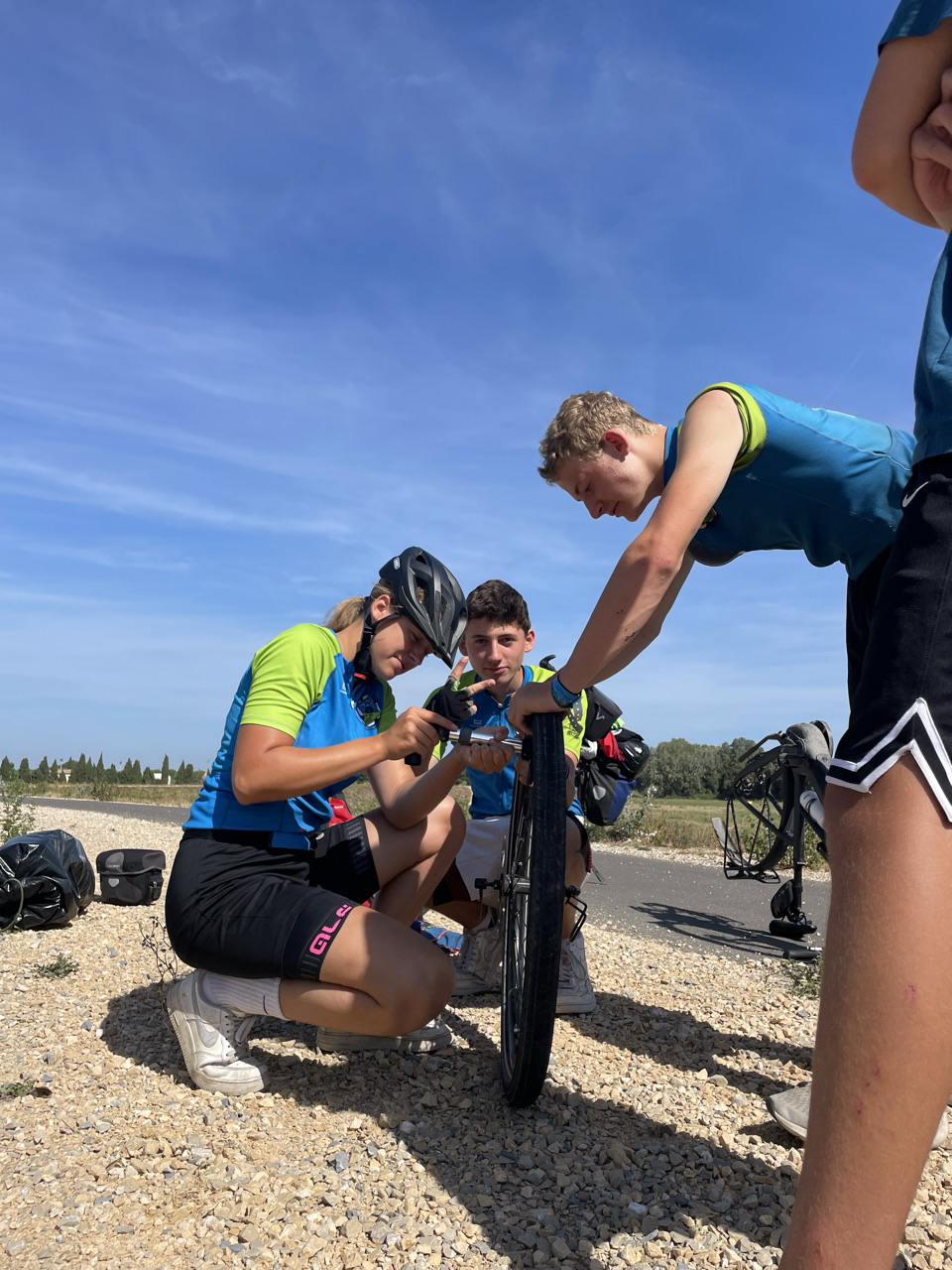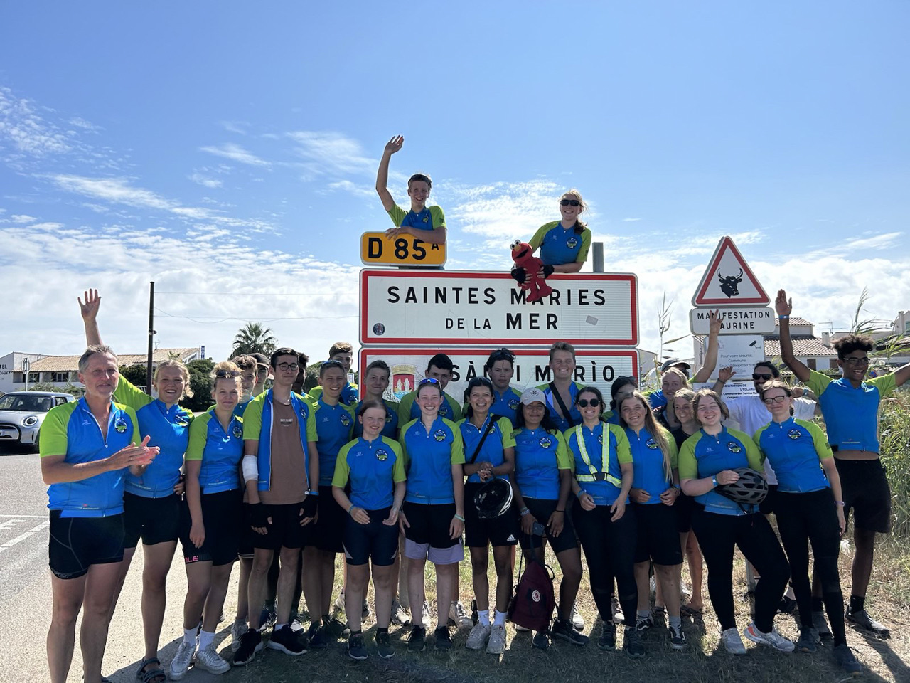 Tag 26: Unser letzter Fahrtag! Es ging wieder mal früh los. Als um 5 Uhr die meisten Wecker klingelten, war die Stimmung noch bedeckt. Dies änderte sich aber im Laufe des Morgens. Als wir um 6.30 Uhr anstatt wie vereinbart um 6 Uhr losfuhren, war es noch dunkel und diejenigen mit (mittlerweile) defekter Fahrradbeleuchtung mussten die Stirnlampen rausholen. Bis zu unserem Frühstücksort, welcher 25 km nach Beginn auf der Strecke lag, kamen wir (bis auf einen platten Reifen) gut voran. Unser Weg wurde von einem schönen Sonnenaufgang, den vielen Brücken und der Rhône geprägt. Als wir in einem kleinen, schönen Ort unser Frühstück auspackten, wurden wir von den Ladenbesitzer'innen nicht sehr gern gesehen. Sie schlossen ihre Türen ab, um uns zu vermitteln, dass wir nicht auf die Toilette gehen dürften. Der Ort ging als “schlichteste Möglichkeit für Toiletten” in unsere Tour-Historie ein. Doch wir ließen uns nicht unterkriegen. Auf ging es nach Arles. Bald mussten wir wieder anhalten, weil es zwei Pannen gab. Die konnten aber schnell behoben werden. Mittags machten wir eine 2-stündige Pause in Arles. Danach hieß es Endspurt. Bis zu unserem Ziel "Saintes-Maries-de-la-Mer" waren es noch um die 40 km. Während unsere Vorfreude auf die Meeresluft immer weiter stieg, konnten wir eine fast schlagartige Veränderung der Landschaft wahrnehmen: Die Berge waren verschwunden, statt dessen Wiesen und Sträucher. Die letzten Kilometer fuhren wir durch die Camargue. Begleitet von Flamingos, weißen Pferden, Stieren und schöner Aussicht. Der Weg allerdings war nicht so schön: eine Schotterstraße, die mehr Schlagloch als Straße war. Durch die ganze Bewegung verloren die Einen oder Anderen einige unter die Spanngurte geklemmte Gegenstände. Große Verluste wurden aber nicht gemacht. Nachdem unsere Motivation allmählich zu wünschen übrig ließ, hob sich diese, als zwei kranke Schülerinnen wieder zur Gruppe stießen. So konnten wir gemeinsam die finalen drei Kilometer mit maximalem Gegenwind fahren. Die Stimmung steigerte sich und man merkte, wie sich auch das Tempo steigerte. Die Vorfreude endlich anzukommen nach ≈1900 Kilometern war riesig. Und dann hat es nicht mehr lange gedauert und wir hatten es geschafft! Darauf haben wir so lange gewartet. Das Gefühl war unbeschreiblich! Wir passierten das Ortsschild mit guter Laune und viel Applaus. Moritz' Eltern haben uns schon erwartet. Sie sind gekommen, um die Fahrräder zurück nach Deutschland zu transportieren. Natürlich haben wir Halt gemacht und sind uns in die Arme gefallen. Glück, Erleichterung und viele andere Gefühle prasselten auf uns ein. Mit einem Grinsen im Gesicht und nach einem Foto am Ortsschild, fuhren wir so schnell es ging zum Meer. Alle sind mit Geschrei und teilweise mit Klamotten ins Meer gerannt. Wir haben es geschafft! Nach so viel harter Arbeit. Die meisten von uns können es immer noch nicht glauben, aber es ist wahr. Wir sind mit dem Fahrrad in vier Wochen knapp 1900 km von Paderborn bis nach Saintes-Maries-de-la-Mer gefahren.