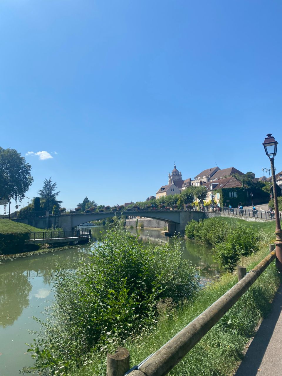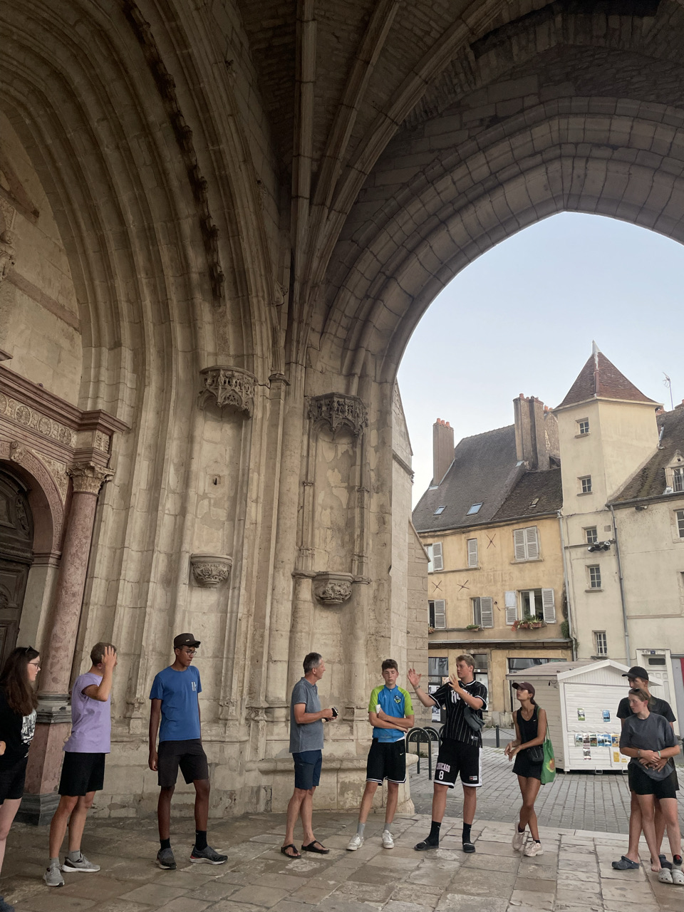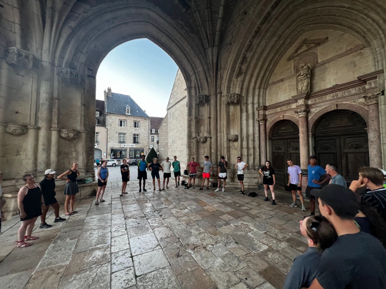 Tag 15: Am heutigen Tag waren die Abfahrtszeiten etwas unterschiedlich, 6 Uhr und 6:30 Uhr. Das lag daran, dass die eine Gruppe schneller fertig geworden ist als die andere. Mit dem Sonnenaufgang fuhren wir los. Nach ca. 7 km haben wir uns dann in Besançon fürs Frühstück und fürs Mittagessen eingedeckt und sind als ganze Gruppe weitergefahren. Am Vormittag haben wir mal etwas Neues ausprobiert. Als wir aus Besançon herausgefahren waren, haben wir uns auseinander fallen lassen. Jeder konnte in seinem Tempo und für sich allein fahren. Geredet werden durfte ausnahmsweise nicht. Dies war für die meisten Schüler*innen sehr angenehm, andere jedoch freuten sich, als wir an einem schönen Ort einen kurzen Stop einlegen und wieder reden durften. Das Tagesziel war Dôle. Wir haben den Campingplatz so früh erreicht, dass die Rezeption noch in der Mittagspause war. In der Wartezeit hat sich ein Teil ausgeruht, und die anderen sind zur naheliegende Badestelle gegangen. So ließ sich die Hitze am besten aushalten. Am Abend haben wir uns im Stadtzentrum am Dom zur gemeinsamen Runde getroffen. Die Atmosphäre war durch die untergehende Sonne auf den Gebäuden sehr schön. Später stromerten wir noch durch die Stadt und genossen das französische Ambiente. Wir kamen erst spät zu Bett, in großer Vorfreude auf den morgigen Pausentag.