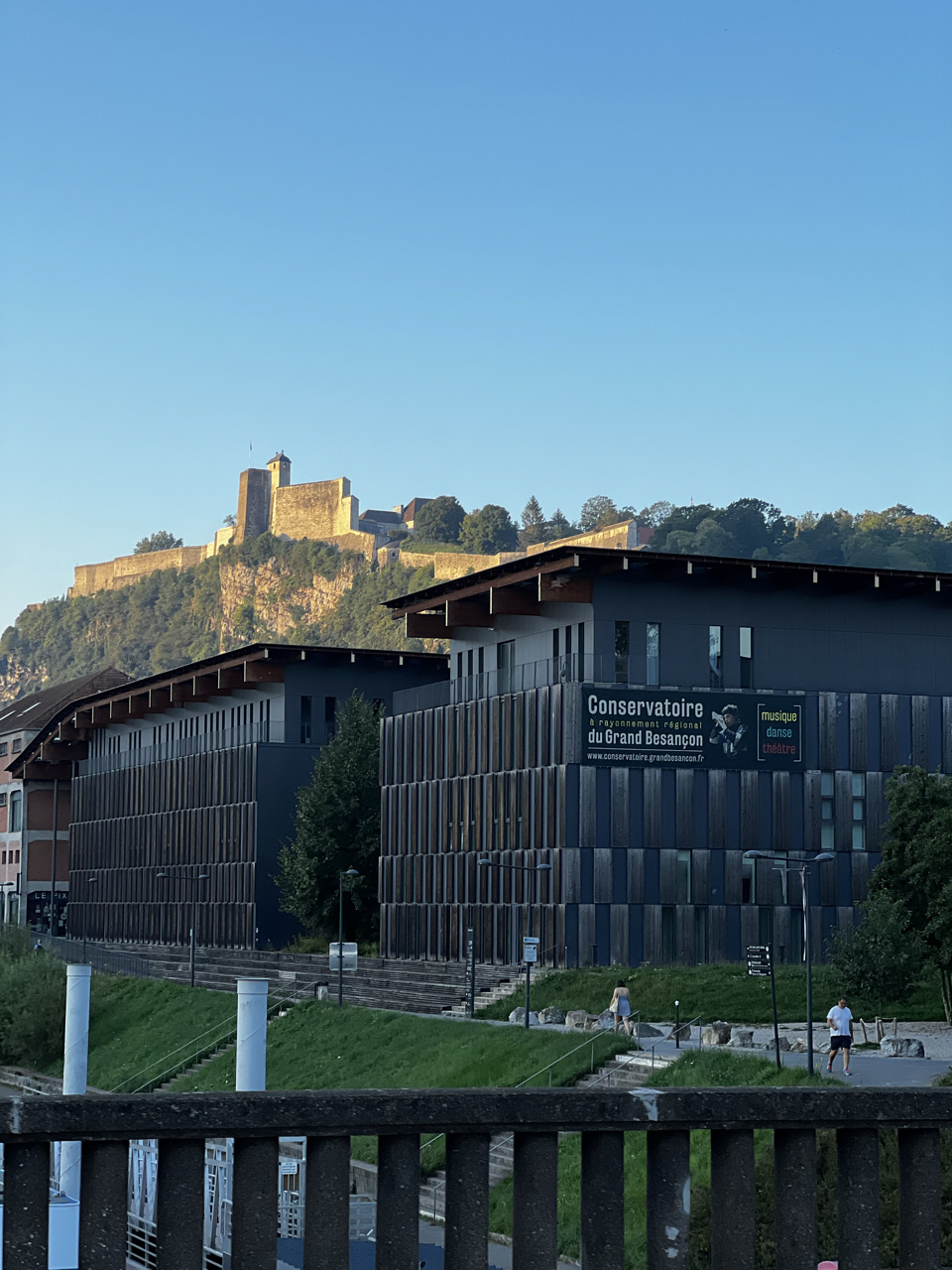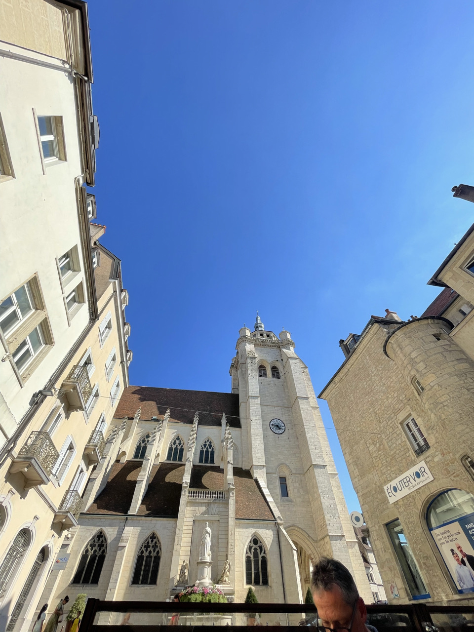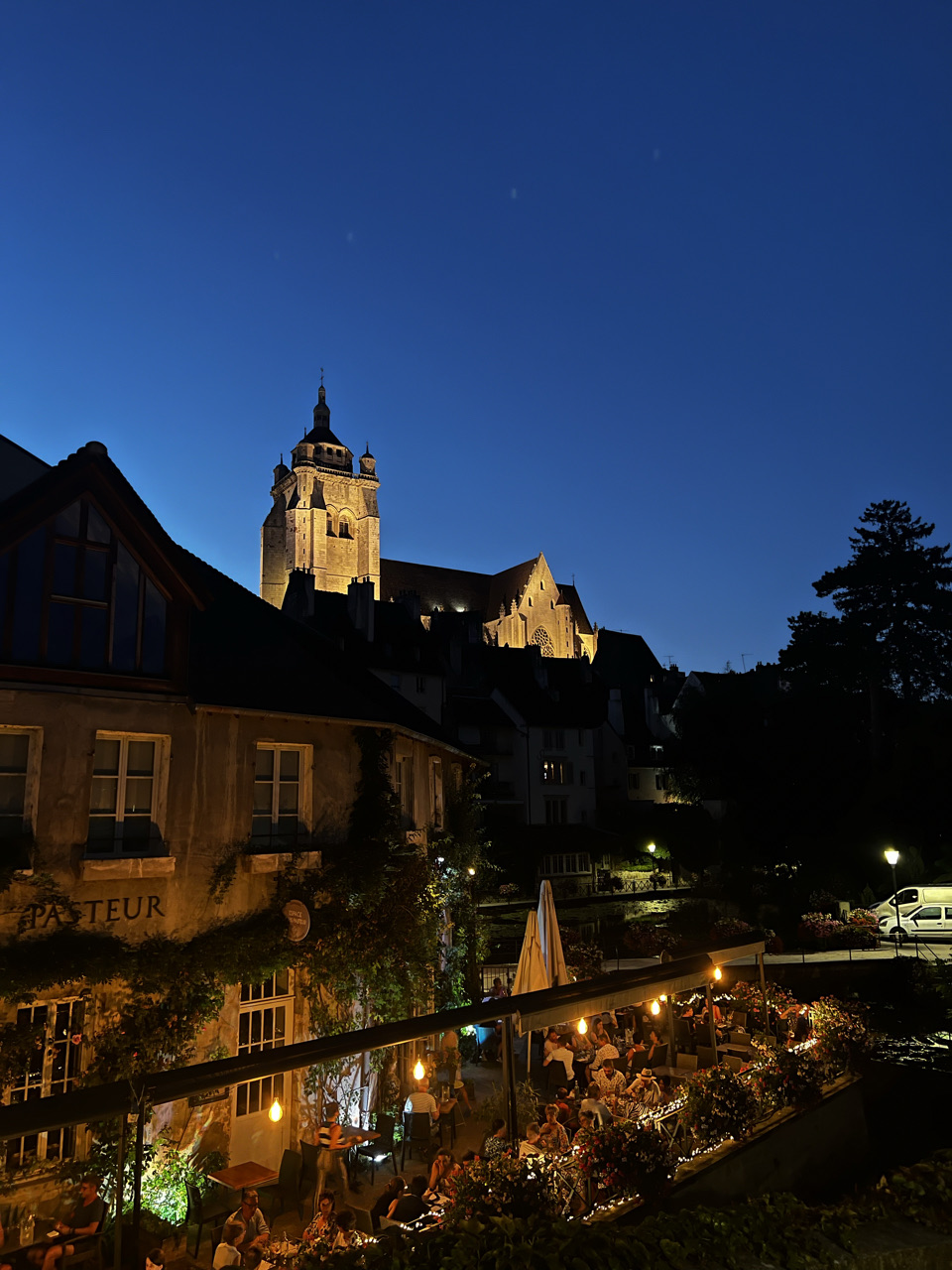 Tag 15: Am heutigen Tag waren die Abfahrtszeiten etwas unterschiedlich, 6 Uhr und 6:30 Uhr. Das lag daran, dass die eine Gruppe schneller fertig geworden ist als die andere. Mit dem Sonnenaufgang fuhren wir los. Nach ca. 7 km haben wir uns dann in Besançon fürs Frühstück und fürs Mittagessen eingedeckt und sind als ganze Gruppe weitergefahren. Am Vormittag haben wir mal etwas Neues ausprobiert. Als wir aus Besançon herausgefahren waren, haben wir uns auseinander fallen lassen. Jeder konnte in seinem Tempo und für sich allein fahren. Geredet werden durfte ausnahmsweise nicht. Dies war für die meisten Schüler*innen sehr angenehm, andere jedoch freuten sich, als wir an einem schönen Ort einen kurzen Stop einlegen und wieder reden durften. Das Tagesziel war Dôle. Wir haben den Campingplatz so früh erreicht, dass die Rezeption noch in der Mittagspause war. In der Wartezeit hat sich ein Teil ausgeruht, und die anderen sind zur naheliegende Badestelle gegangen. So ließ sich die Hitze am besten aushalten. Am Abend haben wir uns im Stadtzentrum am Dom zur gemeinsamen Runde getroffen. Die Atmosphäre war durch die untergehende Sonne auf den Gebäuden sehr schön. Später stromerten wir noch durch die Stadt und genossen das französische Ambiente. Wir kamen erst spät zu Bett, in großer Vorfreude auf den morgigen Pausentag.