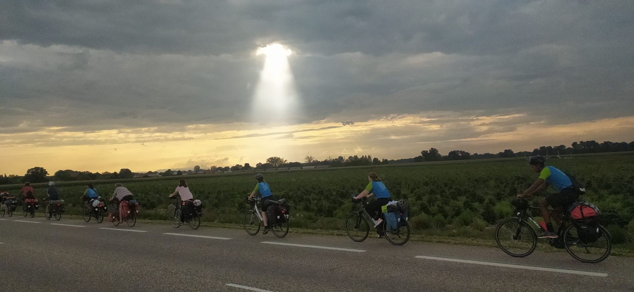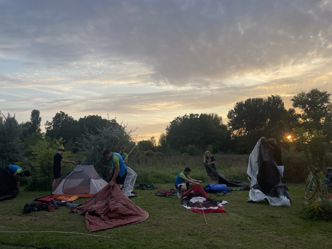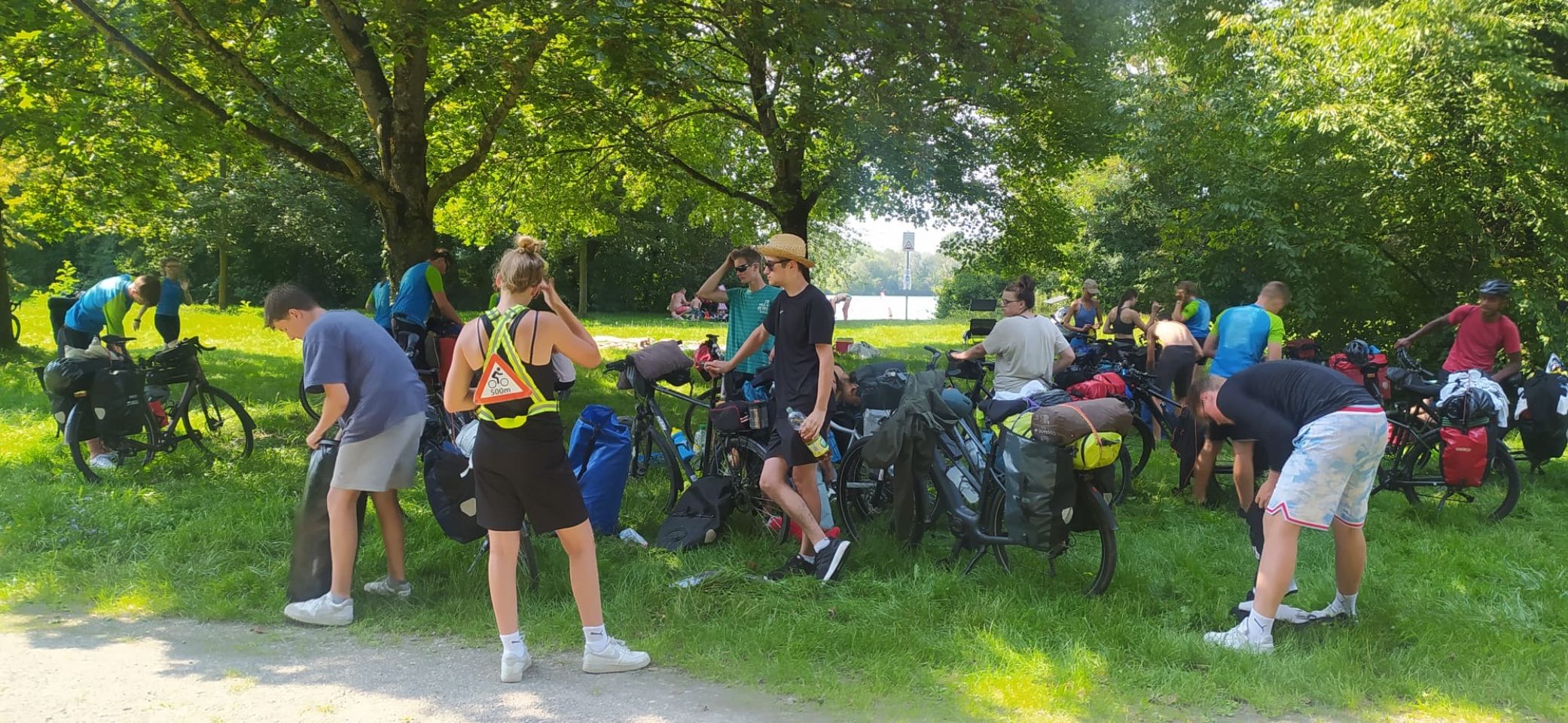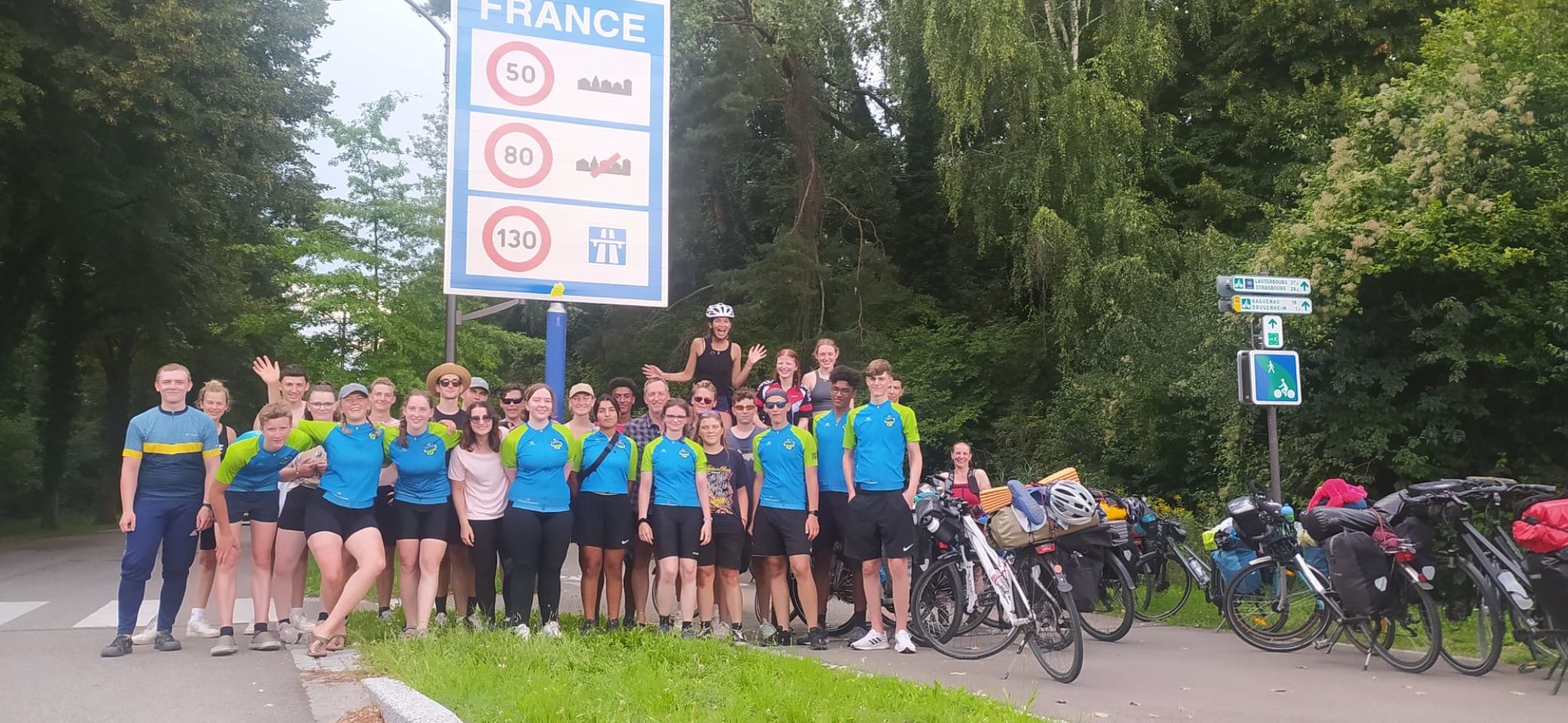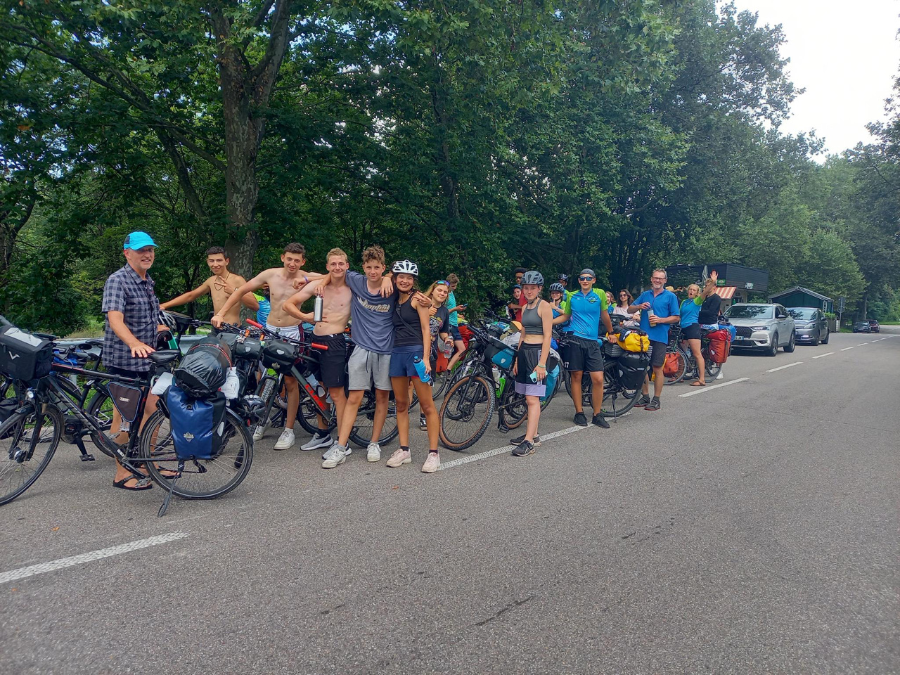 Tag 10: Heute stand eine besondere Fahrt an: Wir fuhren über die Grenze nach Frankreich! Da es mehrere Krankheitsfälle gab, sind ein paar Schülerinnen die ersten 30 km mit dem Zug gefahren. Für die anderen ging es weiter am Rhein entlang. Mittags trafen alle zusammen und wir machten eine schöne und vor allem erfrischende Pause an einem naheliegenden Badesee. Danach ging weiter durch die Mittagshitze. Als wir endlich auf der Fähre nach Frankreich standen, bekamen wir als Willkommens-gruß einen kleinen Regenschauer. Nach etwa 90 km sind wir auch schon an unserem Ziel angekommen. Ein abgelegener „Campingplatz“ kurz vor Straßburg. Das Besondere: Es war ein Privatgrundstück eines netten Herren, den wir überreden konnten uns für eine Nacht aufzunehmen. Es gab zwar nur eine Outdoordusche und eine Toilette für alle, aber dafür einen schönen Platz zum Zelten. Abends ist ein Teil der Gruppe nochmal losgezogen, um sich Straßburg bei Nacht anzuschauen. Das war ein schöner Ausflug. Wir freuen uns, Deutschland jetzt hinter uns zu lassen und sind gespannt, was uns in Frankreich erwarten wird.