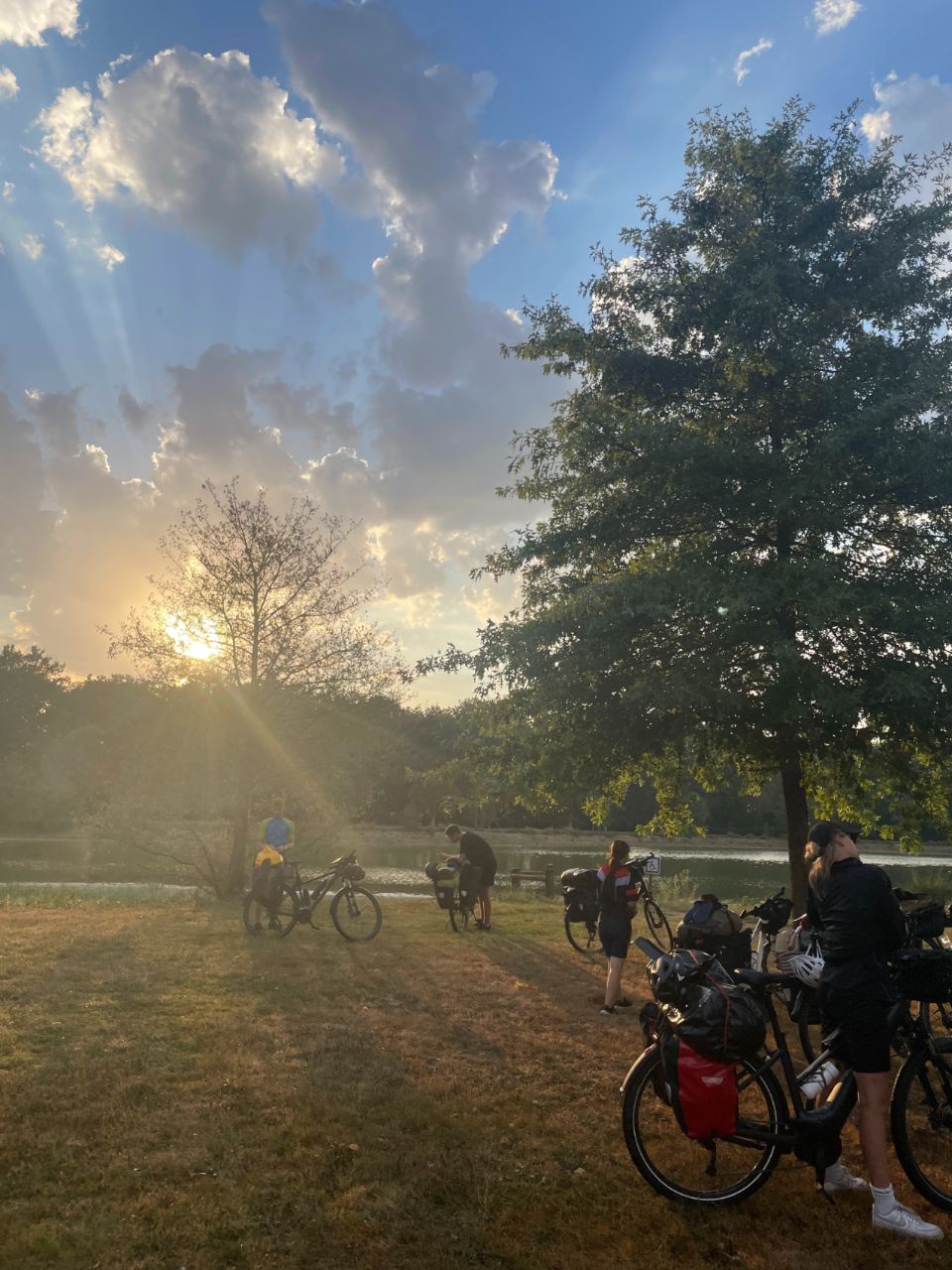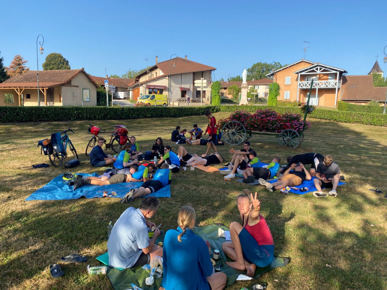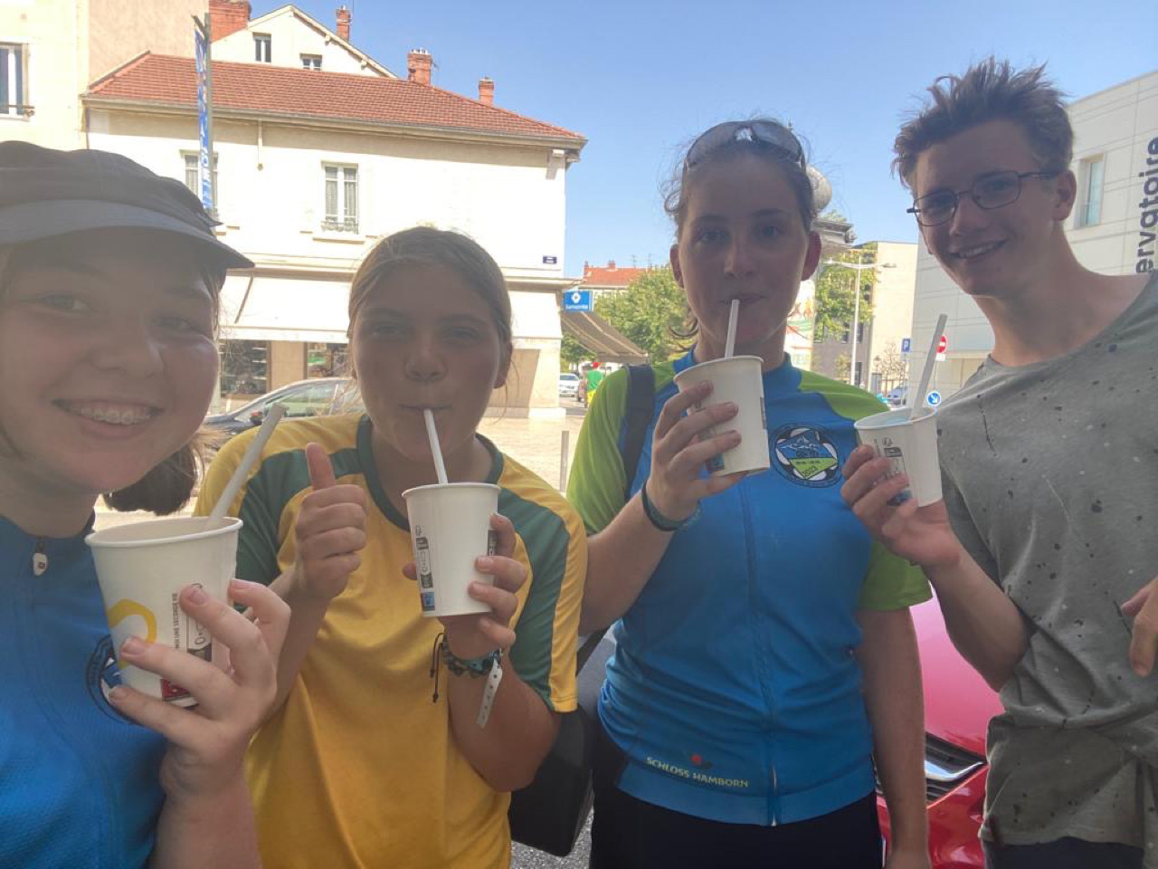 Tag 18: Da uns ein weiterer Tag mit glühender Hitze bevorstand, wurden wir - wie am Tag zuvor - wieder früh von unseren Weckern aus den Schlafsäcken geklingelt. Fast 40° sollten es werden, weswegen wir ca. um 6:30 Uhr vom Campingplatz in Louhans abfuhren. Etwa 75 km erwarteten uns. Direkt am Anfang unserer Etappe begrüßten uns hohe Berge, welche wir zu überwinden hatten. Trotz der bergigen Strecke kamen wir gut voran, zumindest bis sich ein Teil der Gruppe verfuhr. So teilte sich die Gruppe in zwei, welche nun separat voneinander weiter bis zu unserem Treffpunkt, einem Supermarkt bei Saint-Nizier-le-Bouchoux, fuhren. Neben dem Supermarkt schlugen wir dann gleich unser Frühstückslager auf. Nach dem Frühstück um halb 10, fuhren wir weiter Richtung Bourg-en-Bresse. Dort sollte unsere Mittagspause stattfinden. Wir kamen immer schleppender voran, da die Hitze immer weiter zunahm. So kamen wir erst kurz nach 12 Uhr in Bourg-en-Bresse an. Dort hatten wir ca. zweieinhalb Stunden Pause, bzw. sollten wir schon einmal für den Abend einkaufen gehen. Viele nutzten die Pause, um sich auszuruhen und manche holten sich eine kühle Erfrischung, zum Beispiel eine Granita. Am Ende der Pause teilten wir uns wieder in zwei Gruppen auf. Eine Gruppe wollte schnell ihr Ziel erreichen und zügig, soweit das bei der Hitze ging, vorankommen. Die andere Gruppe wollte so langsam und ruhig wie möglich, mit vielen Pausen etc. fahren. Weit hatten wir es nicht mehr. Naja, eigentlich doch. Bei der Hitze war jeder Kilometer eine enorme Anstrengung. Die erste Gruppe fuhr los. Doch schon früher als gedacht musste eine Pause eingelegt werden. Die Hitze war einfach zu stark. Wir bekamen unsere Wasserflaschen aufgefüllt und nahmen wieder Fahrt auf. Doch bald wurde wieder Halt gemacht. Da das erste Wasser sehr eisenhaltig geschmeckt hatte, hielten wir bei einer Bar an, welche uns netterweise eiskaltes frisches Wasser zur Verfügung stellte. Nach dieser Pause fuhr die Gruppe den Rest der Strecke bis zum Campingplatz. Dort versuchten wir Platz für uns zu finden, wurden aber abgewiesen, da er wohl zu voll war. Dann war auch noch Gewitter angesagt. Da wir uns nicht einmal unterstellen durften, bauten sich ein paar mit einer Plane ein improvisiertes trockenes Plätzchen, während sich die anderen bei den Bäumen unterstellten. Dies klappte nur bedingt bis gar nicht. So blieben wir ca. zwei Stunden, bis die anderen zu uns stoßen sollten. Währenddessen bei der anderen Gruppe: Kurz nach der ersten Gruppe brach auch die zweite auf. Erst wollten sie langsam durch die Hitze radeln. Doch schon bald, noch in Bourg-en-Bresse, brachen sie ab, da es einer Schülerin nicht gut ging. Sie fuhren wieder zurück in die Stadt und ließen sich in einer Bar nieder, bis die Hitze etwas nachgelassen hatte. Sie erzählten dem Barbesitzer von unserem Projekt und überreichtem ihm einen Flyer. Daraufhin rief er kurzerhand die Zeitung an, welche für ein paar Fotos und ein Gespräch vorbeikam. Später stießen zwei aus der Gruppe, welche mit ihrem Fahrrad in der Werkstatt waren dazu. Auch der Bulli kam, um die kranke Schülerin abzuholen. Durch das nahende Gewitter verzögerte sich die Abfahrt wiederholt. Sie warteten erst das Unwetter ab und brachen danach auf. Bei dem Campingplatz, bei dem wir eher weniger erwünscht waren, trafen wieder alle zusammen. Dort wurde dann überlegt was zu machen wäre. Zumindest bekamen wir von den Leuten des Campingplatzes einen Kontakt eines früheren Campingplatzes, welcher allerdings eigentlich seit einem Jahr geschlossen hatte. Doch wir versuchten unser Glück und der Bulli mit Raphaela und Elie schaute schon einmal für uns vor, ob es klappen könnte. Und tatsächlich, obwohl der Campingplatz als geschlossen galt, wurde er für uns als Truppe für diese Nacht wiedereröffnet. So fuhren wir, alle schon ziemlich am Ende von dem von Extremwetter geprägtem Tag, weitere 7 km. Gerade angekommen, ging schon die Sonne unter, doch der Campingplatz an sich gab einiges her. Theoretisch gab es auch direkt neben dem Campingplatz einen Badesee, der wurde allerdings durch das späte Eintreffen nicht mehr genutzt. Schnell waren alle beschäftigt, viel Zeit blieb ja nicht. Es wurden Zelte aufgebaut, sich frischgemacht, geduscht und gekocht. Herr Langrock hielt die Abendrunde extra kurz und direkt nach dem Eintreffen, damit jeder schnell seine Sachen erledigen konnte. Relativ spät ging es dann für die meisten ins „Bett“. Und so ging ein anstrengender, aber auch ereignisreicher Tag zu Ende.