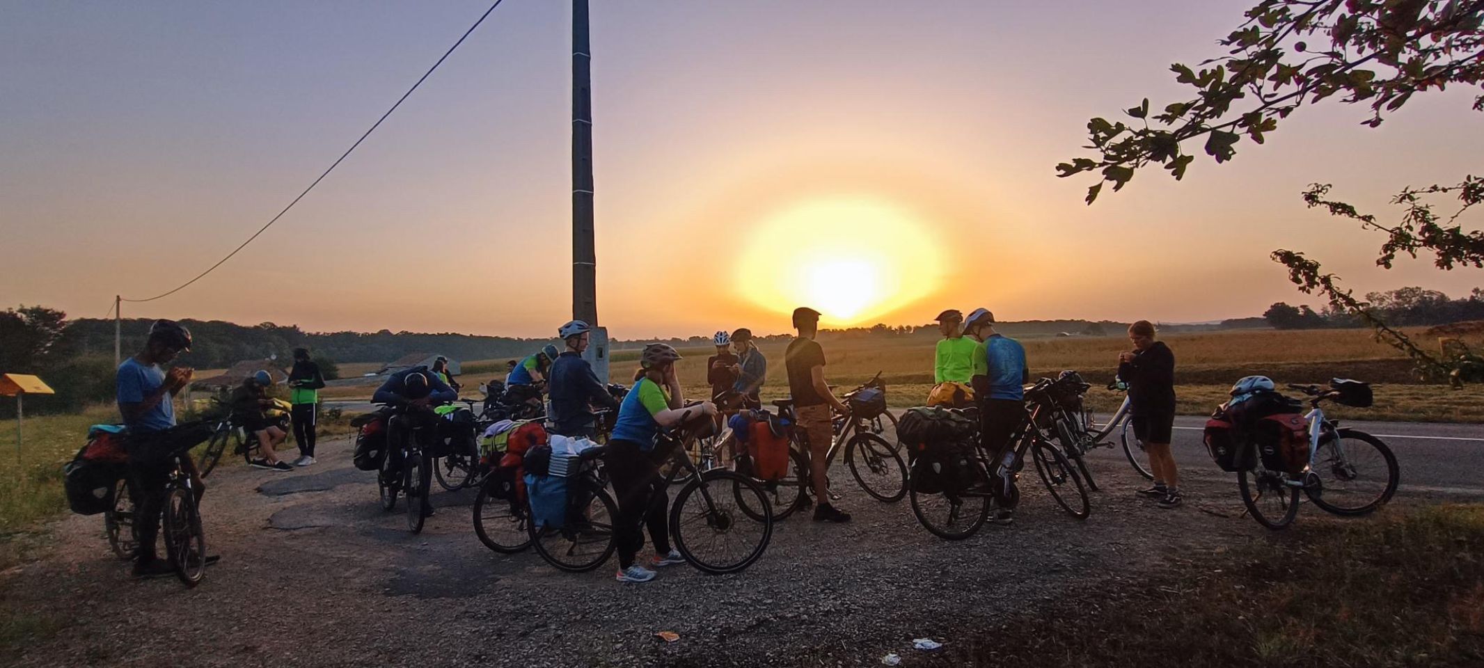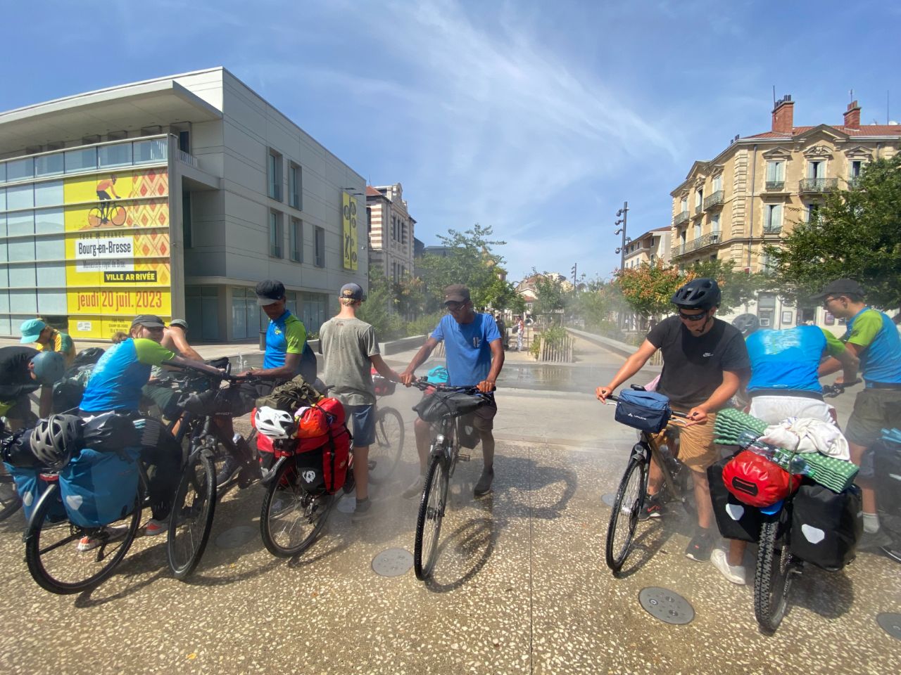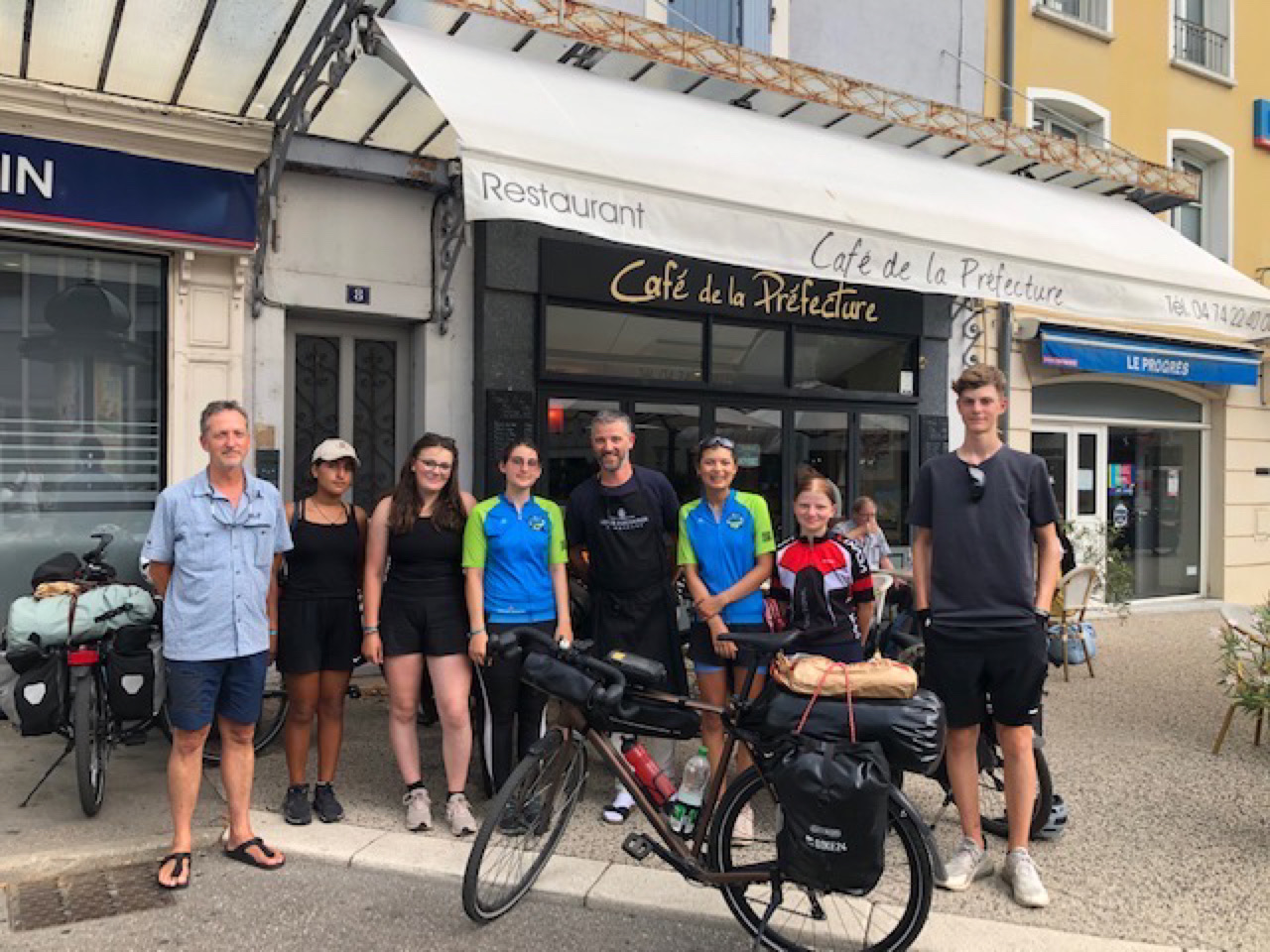 Tag 18: Da uns ein weiterer Tag mit glühender Hitze bevorstand, wurden wir - wie am Tag zuvor - wieder früh von unseren Weckern aus den Schlafsäcken geklingelt. Fast 40° sollten es werden, weswegen wir ca. um 6:30 Uhr vom Campingplatz in Louhans abfuhren. Etwa 75 km erwarteten uns. Direkt am Anfang unserer Etappe begrüßten uns hohe Berge, welche wir zu überwinden hatten. Trotz der bergigen Strecke kamen wir gut voran, zumindest bis sich ein Teil der Gruppe verfuhr. So teilte sich die Gruppe in zwei, welche nun separat voneinander weiter bis zu unserem Treffpunkt, einem Supermarkt bei Saint-Nizier-le-Bouchoux, fuhren. Neben dem Supermarkt schlugen wir dann gleich unser Frühstückslager auf. Nach dem Frühstück um halb 10, fuhren wir weiter Richtung Bourg-en-Bresse. Dort sollte unsere Mittagspause stattfinden. Wir kamen immer schleppender voran, da die Hitze immer weiter zunahm. So kamen wir erst kurz nach 12 Uhr in Bourg-en-Bresse an. Dort hatten wir ca. zweieinhalb Stunden Pause, bzw. sollten wir schon einmal für den Abend einkaufen gehen. Viele nutzten die Pause, um sich auszuruhen und manche holten sich eine kühle Erfrischung, zum Beispiel eine Granita. Am Ende der Pause teilten wir uns wieder in zwei Gruppen auf. Eine Gruppe wollte schnell ihr Ziel erreichen und zügig, soweit das bei der Hitze ging, vorankommen. Die andere Gruppe wollte so langsam und ruhig wie möglich, mit vielen Pausen etc. fahren. Weit hatten wir es nicht mehr. Naja, eigentlich doch. Bei der Hitze war jeder Kilometer eine enorme Anstrengung. Die erste Gruppe fuhr los. Doch schon früher als gedacht musste eine Pause eingelegt werden. Die Hitze war einfach zu stark. Wir bekamen unsere Wasserflaschen aufgefüllt und nahmen wieder Fahrt auf. Doch bald wurde wieder Halt gemacht. Da das erste Wasser sehr eisenhaltig geschmeckt hatte, hielten wir bei einer Bar an, welche uns netterweise eiskaltes frisches Wasser zur Verfügung stellte. Nach dieser Pause fuhr die Gruppe den Rest der Strecke bis zum Campingplatz. Dort versuchten wir Platz für uns zu finden, wurden aber abgewiesen, da er wohl zu voll war. Dann war auch noch Gewitter angesagt. Da wir uns nicht einmal unterstellen durften, bauten sich ein paar mit einer Plane ein improvisiertes trockenes Plätzchen, während sich die anderen bei den Bäumen unterstellten. Dies klappte nur bedingt bis gar nicht. So blieben wir ca. zwei Stunden, bis die anderen zu uns stoßen sollten. Währenddessen bei der anderen Gruppe: Kurz nach der ersten Gruppe brach auch die zweite auf. Erst wollten sie langsam durch die Hitze radeln. Doch schon bald, noch in Bourg-en-Bresse, brachen sie ab, da es einer Schülerin nicht gut ging. Sie fuhren wieder zurück in die Stadt und ließen sich in einer Bar nieder, bis die Hitze etwas nachgelassen hatte. Sie erzählten dem Barbesitzer von unserem Projekt und überreichtem ihm einen Flyer. Daraufhin rief er kurzerhand die Zeitung an, welche für ein paar Fotos und ein Gespräch vorbeikam. Später stießen zwei aus der Gruppe, welche mit ihrem Fahrrad in der Werkstatt waren dazu. Auch der Bulli kam, um die kranke Schülerin abzuholen. Durch das nahende Gewitter verzögerte sich die Abfahrt wiederholt. Sie warteten erst das Unwetter ab und brachen danach auf. Bei dem Campingplatz, bei dem wir eher weniger erwünscht waren, trafen wieder alle zusammen. Dort wurde dann überlegt was zu machen wäre. Zumindest bekamen wir von den Leuten des Campingplatzes einen Kontakt eines früheren Campingplatzes, welcher allerdings eigentlich seit einem Jahr geschlossen hatte. Doch wir versuchten unser Glück und der Bulli mit Raphaela und Elie schaute schon einmal für uns vor, ob es klappen könnte. Und tatsächlich, obwohl der Campingplatz als geschlossen galt, wurde er für uns als Truppe für diese Nacht wiedereröffnet. So fuhren wir, alle schon ziemlich am Ende von dem von Extremwetter geprägtem Tag, weitere 7 km. Gerade angekommen, ging schon die Sonne unter, doch der Campingplatz an sich gab einiges her. Theoretisch gab es auch direkt neben dem Campingplatz einen Badesee, der wurde allerdings durch das späte Eintreffen nicht mehr genutzt. Schnell waren alle beschäftigt, viel Zeit blieb ja nicht. Es wurden Zelte aufgebaut, sich frischgemacht, geduscht und gekocht. Herr Langrock hielt die Abendrunde extra kurz und direkt nach dem Eintreffen, damit jeder schnell seine Sachen erledigen konnte. Relativ spät ging es dann für die meisten ins „Bett“. Und so ging ein anstrengender, aber auch ereignisreicher Tag zu Ende.