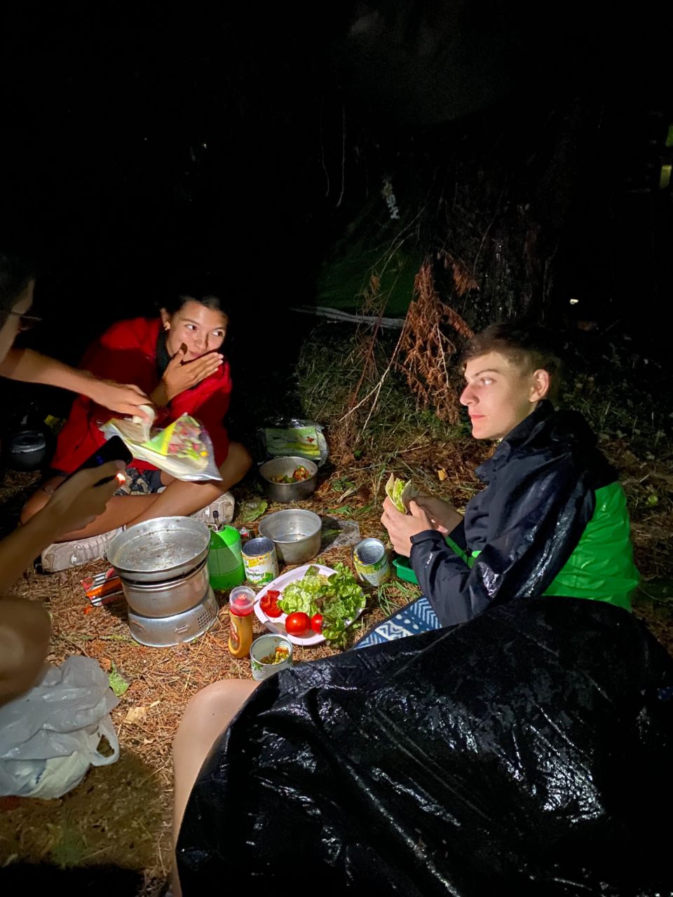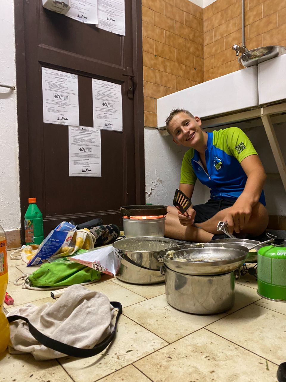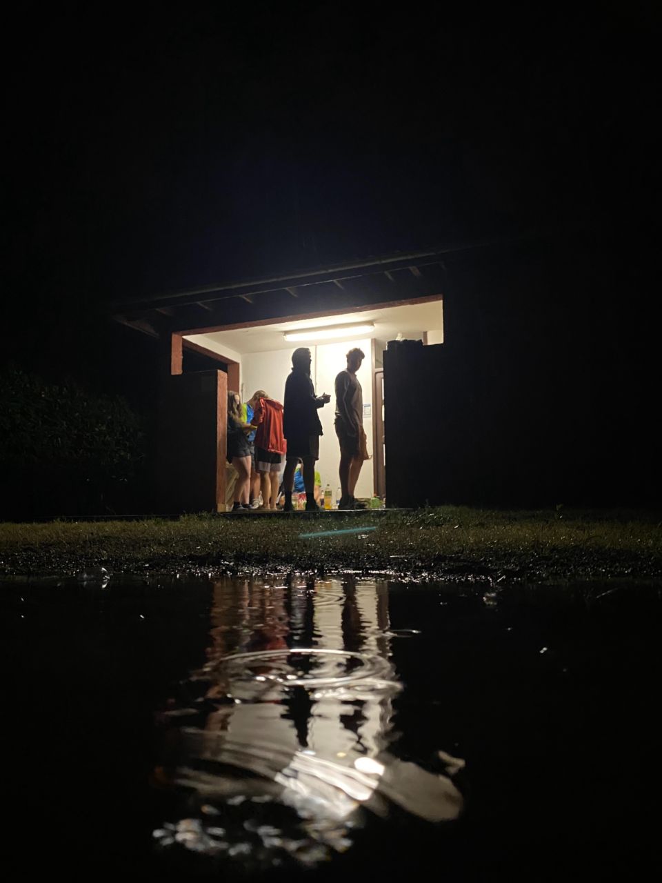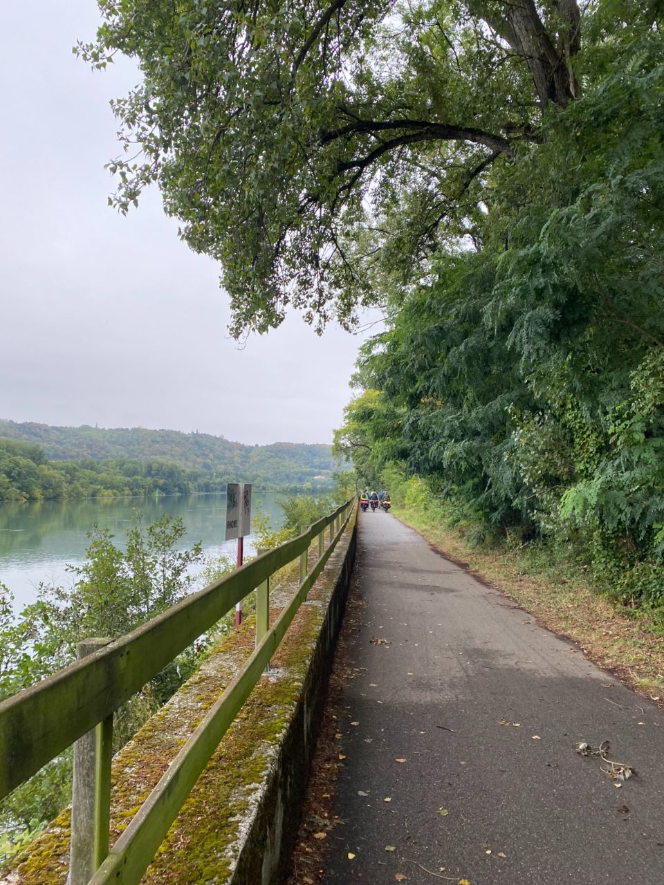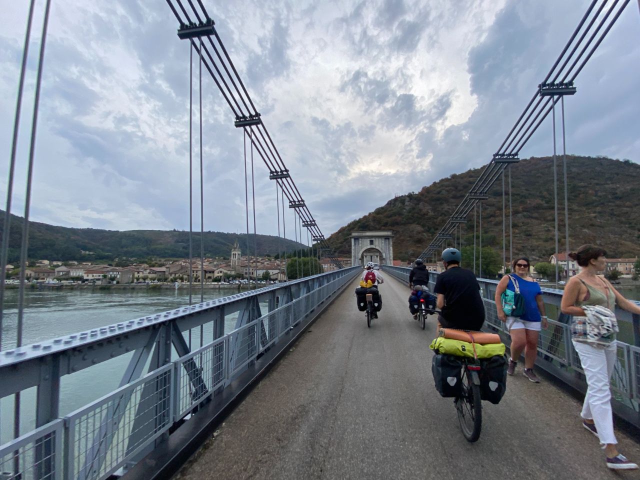 Tag 20: Heute ging es nach einem langen „Stadtabend“, der Nacht im Hostel und einem etwas spartanischen Frühstück vergleichsweise spät auf die Räder. Wir hielten noch einmal an einem Supermarkt und nahmen dort unser zweites Frühstück zu uns. Die Erwachsenen gönnten sich ein Frühstück in einem Café. Danach fuhren wir auf einer sehr idyllischen Strecke Richtung Süden an der Rhône entlang. Wir durften für einige Minuten unser eigenes Tempo fahren, uns also auch mal zurückfallen lassen, uns unterhalten oder schweigen, anhalten, Fotos machen und einfach die Natur in dieser Gegend genießen… Ein schönes Erlebnis! Abends kauften wir nochmal ein und danach waren wir plötzlich in einer sehr speziellen Gegend. Es gab bewaldete Hügel und davor Ebenen, auf denen das Gras größtenteils sehr trocken war. Um uns herum gab es hübsche Natursteinhäuschen mit bunten Fensterläden. Außerdem fuhren wir wieder einmal über eine Hängebrücke mit großen Toren an den Enden. Auf dem Campingplatz angekommen bauten wir schnell unsere Zelte auf. Das war auch gut, denn schon bald darauf fing es an, heftigst zu regnen. Die Abendrunde musste ausnahmsweise ausfallen, da sich alle entweder in ihren Zelten verkrochen oder es sich in den Sanitäranlagen „gemütlich“ gemacht hatten. Außerdem hatten die Erwachsenen ein großes Tarp aufgespannt, unter dem auch Schüler willkommen waren. Der Regen hörte nicht auf. Dies war echt eine Ausnahmesituation! Manche legten sich ohne Abendessen schlafen, manche machten in den Sanitäranlagen das Beste aus der Situation.