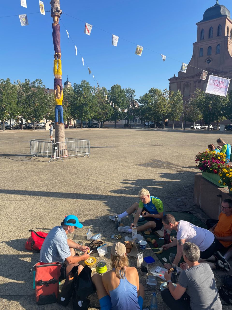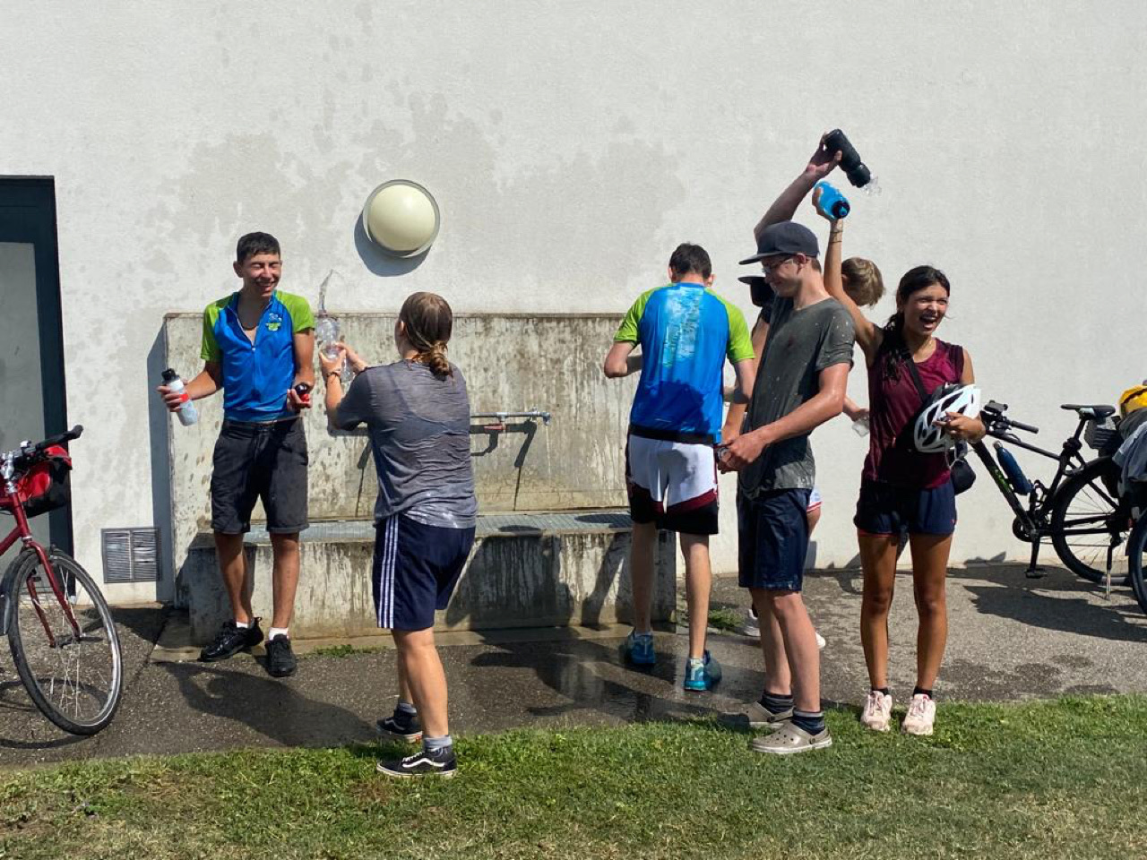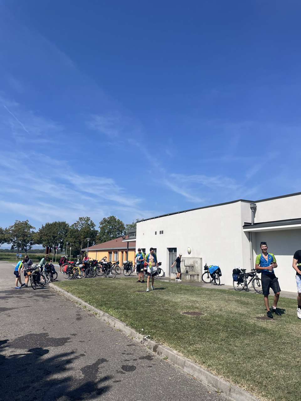 Tag 12: Gegen 08:30 Uhr verließen wir unseren - sagen wir mal schlichten - Campingplatz bei Neuf-Brisach und fuhren ca. einen Kilometer ins Zentrum des hübschen, typisch französischen Dorfes. Dort konnten wir in einer Boulangerie/Pâtisserie für das Frühstück einkaufen und in Ruhe frühstücken. Am Ende der 1 1/2-stündigen Pause erzählte Herr Langrock uns etwas über die Geschichte von Neuf-Brisach. Die Stadt hat als einen einzigartigen Grundriss, nämlich ein Achteck, um das eine gezackte Stadtmauer verläuft. Die Straßen sind schachbrettartig angelegt, sodass man sich schnell innerhalb der Stadt bewegen kann. Kurz nach der Pause trafen wir wieder auf den Rhein-Rhône-Kanal, an dem wir sehr lange entlangfuhren. Es wurde sehr warm, und wir alle hatten viel Durst. Irgendwann gab es kein Wasser mehr in unseren Flaschen. Auf der Suche nach Wasser fanden wir eine Sporthalle mit einer Außenwasserstelle, an der wir unsere Flaschen auffüllten. Schnell entwickelte sich dieses "Auffüllen" zu einer erfrischenden Wasserschlacht! Auf der Weiterfahrt waren dann alle erstmal abgekühlt. Weiter ging es teilweise auch durch den schattigen Wald. Mittags erreichten wir den Campingplatz in Mulhouse (Mühlhausen). Wir packten unsere Sachen aus, nutzen die Waschmaschinen, bauten Zelte auf und taten das, was wir noch für wichtig hielten. Spät abends hatten wir Besuch von unserem ehemaligen Mitschüler Alexander. Außerdem wurden noch Pfannkuchen gemacht!