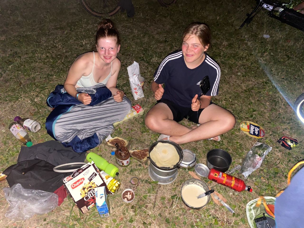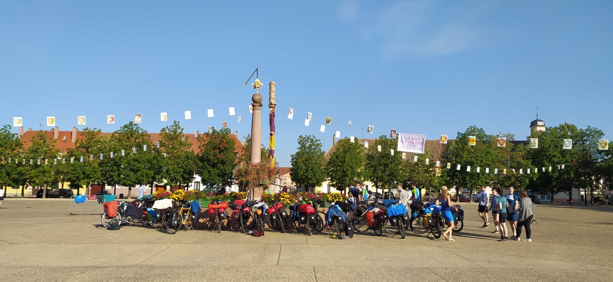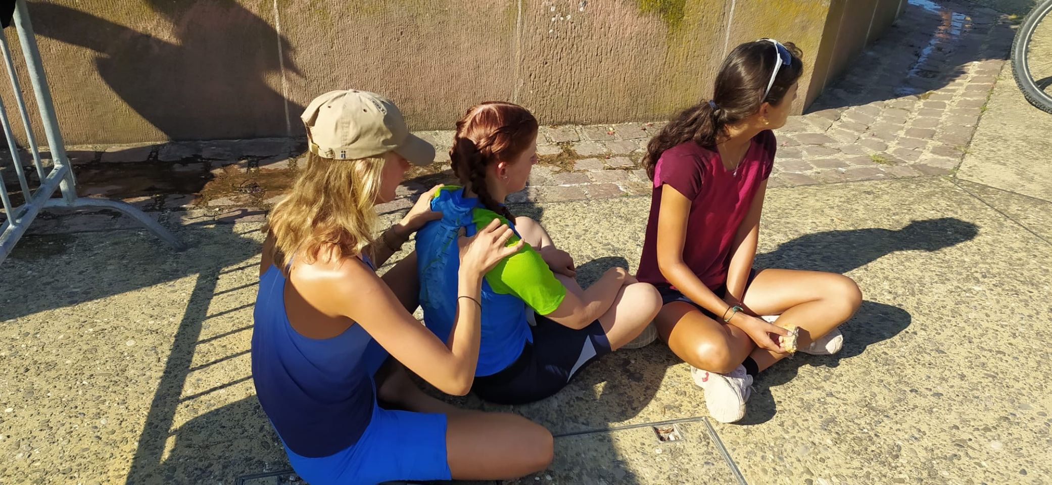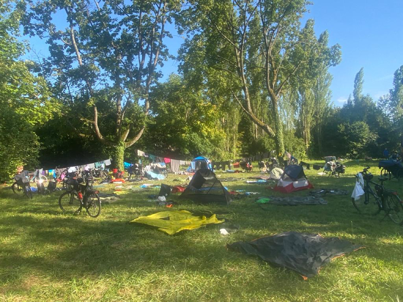 Tag 12: Gegen 08:30 Uhr verließen wir unseren - sagen wir mal schlichten - Campingplatz bei Neuf-Brisach und fuhren ca. einen Kilometer ins Zentrum des hübschen, typisch französischen Dorfes. Dort konnten wir in einer Boulangerie/Pâtisserie für das Frühstück einkaufen und in Ruhe frühstücken. Am Ende der 1 1/2-stündigen Pause erzählte Herr Langrock uns etwas über die Geschichte von Neuf-Brisach. Die Stadt hat als einen einzigartigen Grundriss, nämlich ein Achteck, um das eine gezackte Stadtmauer verläuft. Die Straßen sind schachbrettartig angelegt, sodass man sich schnell innerhalb der Stadt bewegen kann. Kurz nach der Pause trafen wir wieder auf den Rhein-Rhône-Kanal, an dem wir sehr lange entlangfuhren. Es wurde sehr warm, und wir alle hatten viel Durst. Irgendwann gab es kein Wasser mehr in unseren Flaschen. Auf der Suche nach Wasser fanden wir eine Sporthalle mit einer Außenwasserstelle, an der wir unsere Flaschen auffüllten. Schnell entwickelte sich dieses "Auffüllen" zu einer erfrischenden Wasserschlacht! Auf der Weiterfahrt waren dann alle erstmal abgekühlt. Weiter ging es teilweise auch durch den schattigen Wald. Mittags erreichten wir den Campingplatz in Mulhouse (Mühlhausen). Wir packten unsere Sachen aus, nutzen die Waschmaschinen, bauten Zelte auf und taten das, was wir noch für wichtig hielten. Spät abends hatten wir Besuch von unserem ehemaligen Mitschüler Alexander. Außerdem wurden noch Pfannkuchen gemacht!