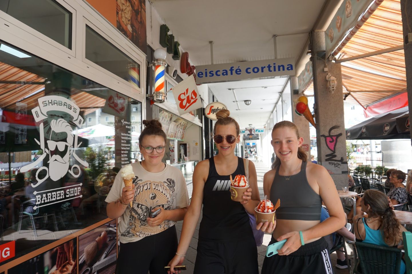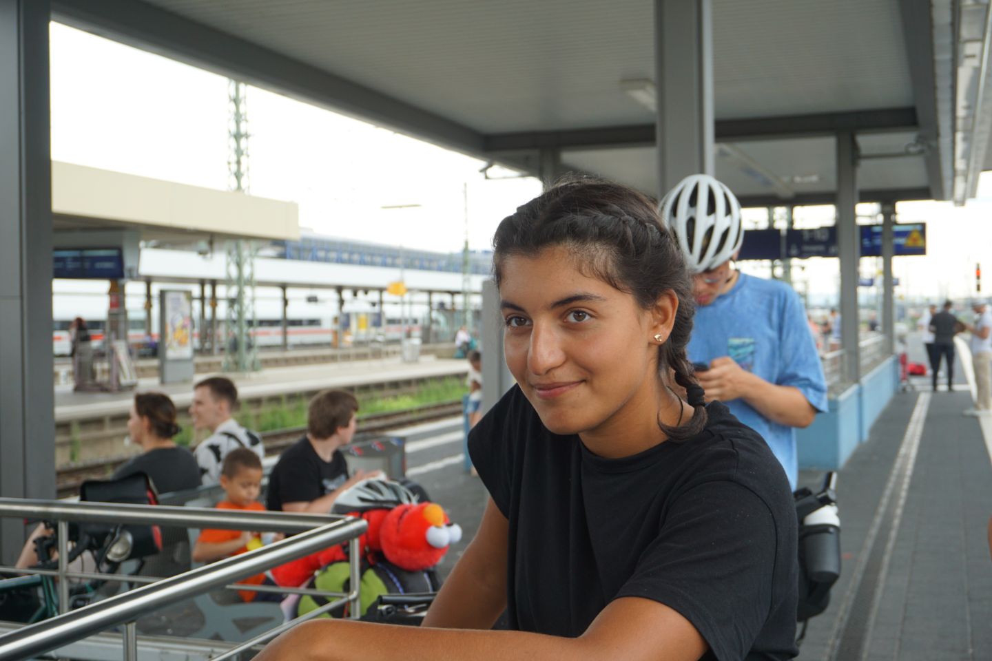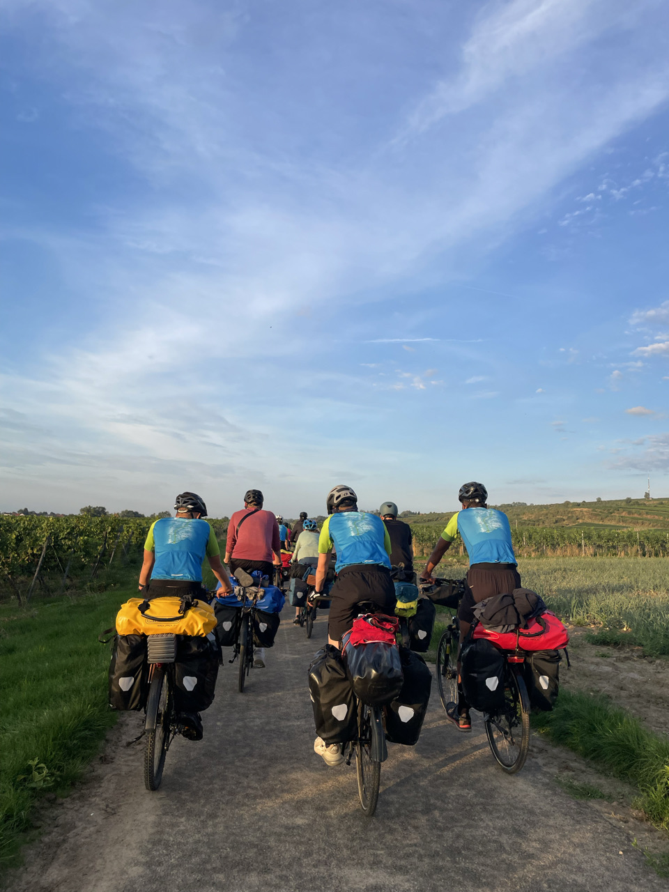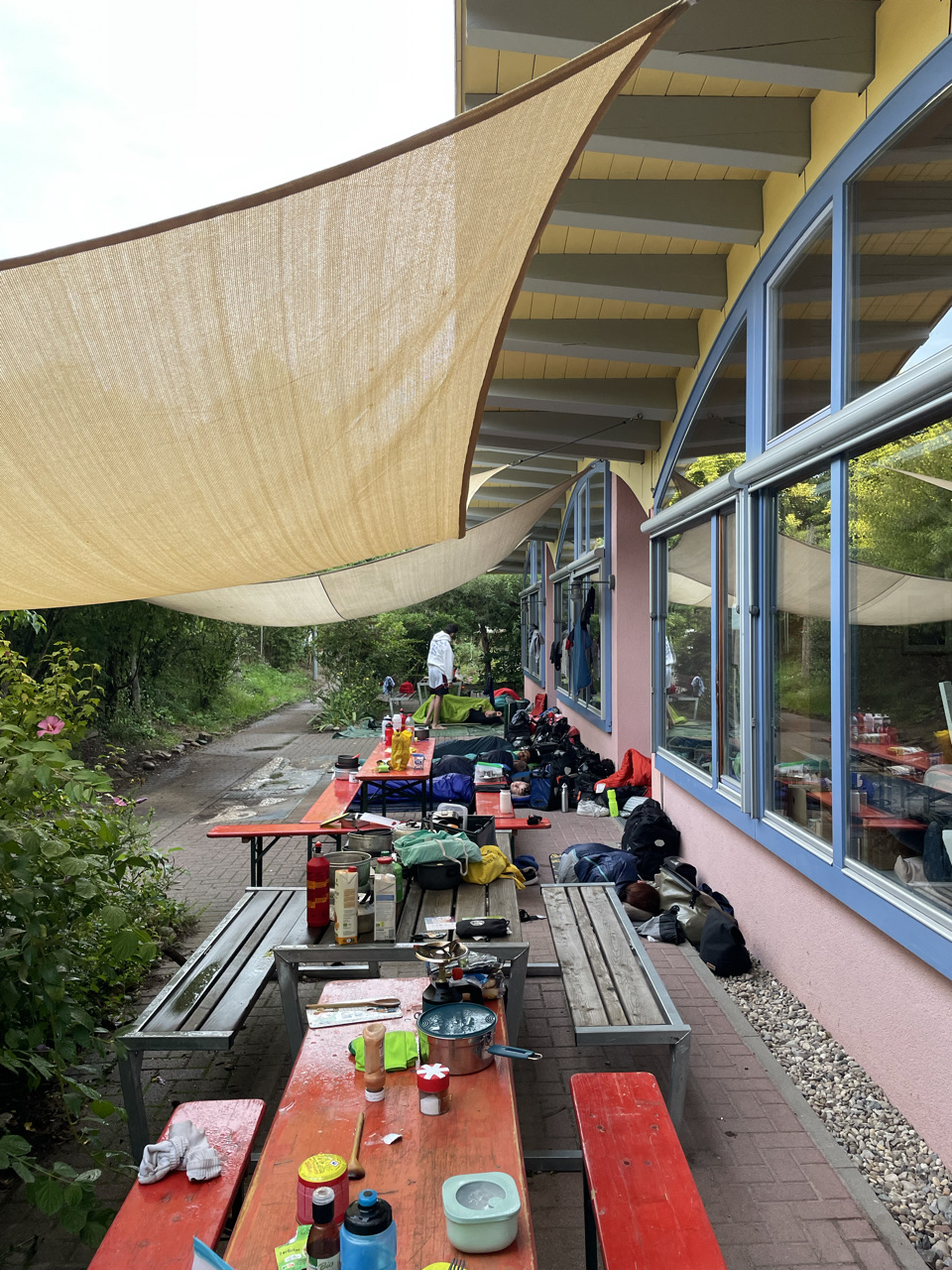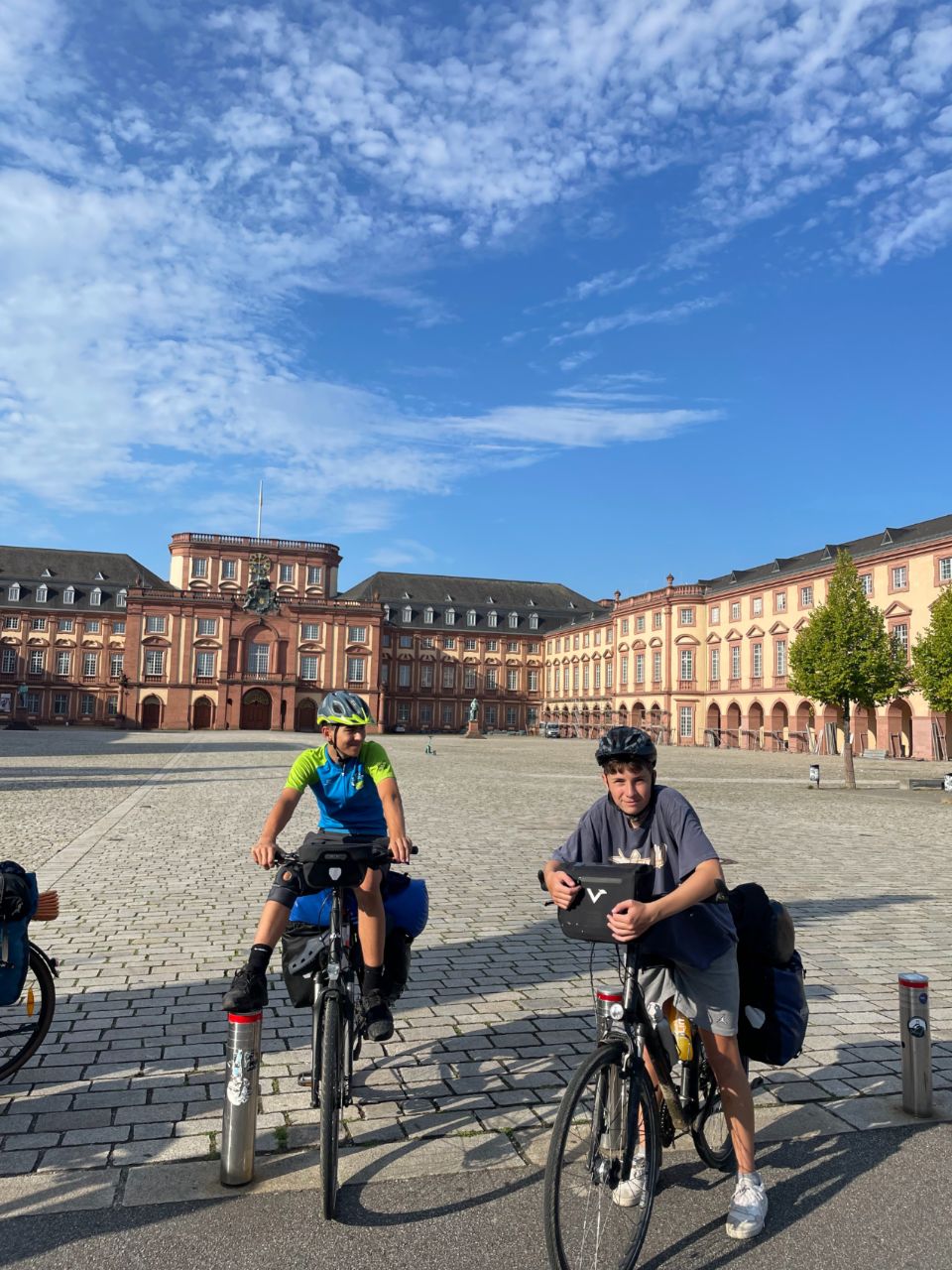 Tag 9: Heute haben wir die Gruppe aufgeteilt. Es gab eine lange Etappe für alle, die noch (oder vielleicht sogar zu viel) Kraft in den Beinen hatten. Und dann gab es einen Zug-/Aufräum-/Einkaufs-/Eisess-/Schontag für diejenigen, die ihre Kräfte ein bisschen zusammenhalten mussten. Die Radler-Truppe machte sich um 6 Uhr auf den Weg nach Karlsruhe. Mit dabei war auch wieder Josef, der doch noch ein paar Tage freischaufeln konnte, um uns zu begleiten. Mit seinem Reparatur-Know-How dabei konnten wir entspannter in die lange Tour starten. Um 9 Uhr - nach 50 Kilometern!! - gab es einen Frühstücksstop in Mannheim. Danach ging es immer weiter den Rhein hinauf. Die Strecke war sehr schön und flach, die Stimmung gut. Es rollte! Schon am frühen Abend erreichte die Gruppe die Karlsruher Waldorfschule -und das mit sage und schreibe 156 Kilometern auf dem Tacho. Der Tag der zweiten Gruppe startete um 9 Uhr mit einem Frühstück im Kanuclub. Danach ging es in Kleingruppen aufgeteilt zum Zug. 15 Menschen plus Fahrräder plus Gepäck ist nämlich keine besonders gute Idee. Trotz der kleinen Gruppen war es eine stressige Zugfahrt. Diese wurde allerdings mit einem gemütlichen Nachmittag im wunderschönen Karlsruher Schlosspark belohnt. Am Abend trafen wir alle wieder zusammen, kochten und richteten die Schlafplätze und berichteten einander von unseren Erlebnissen.