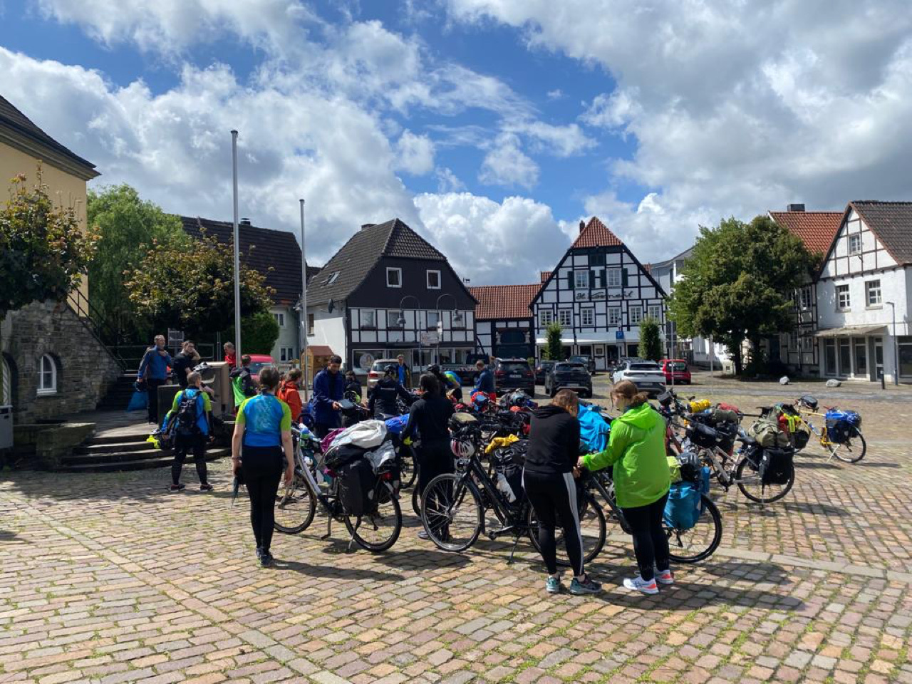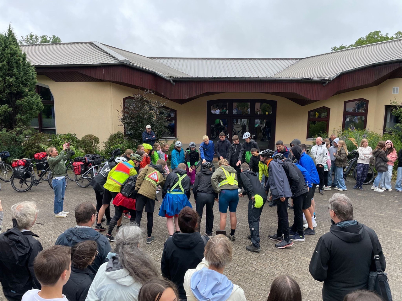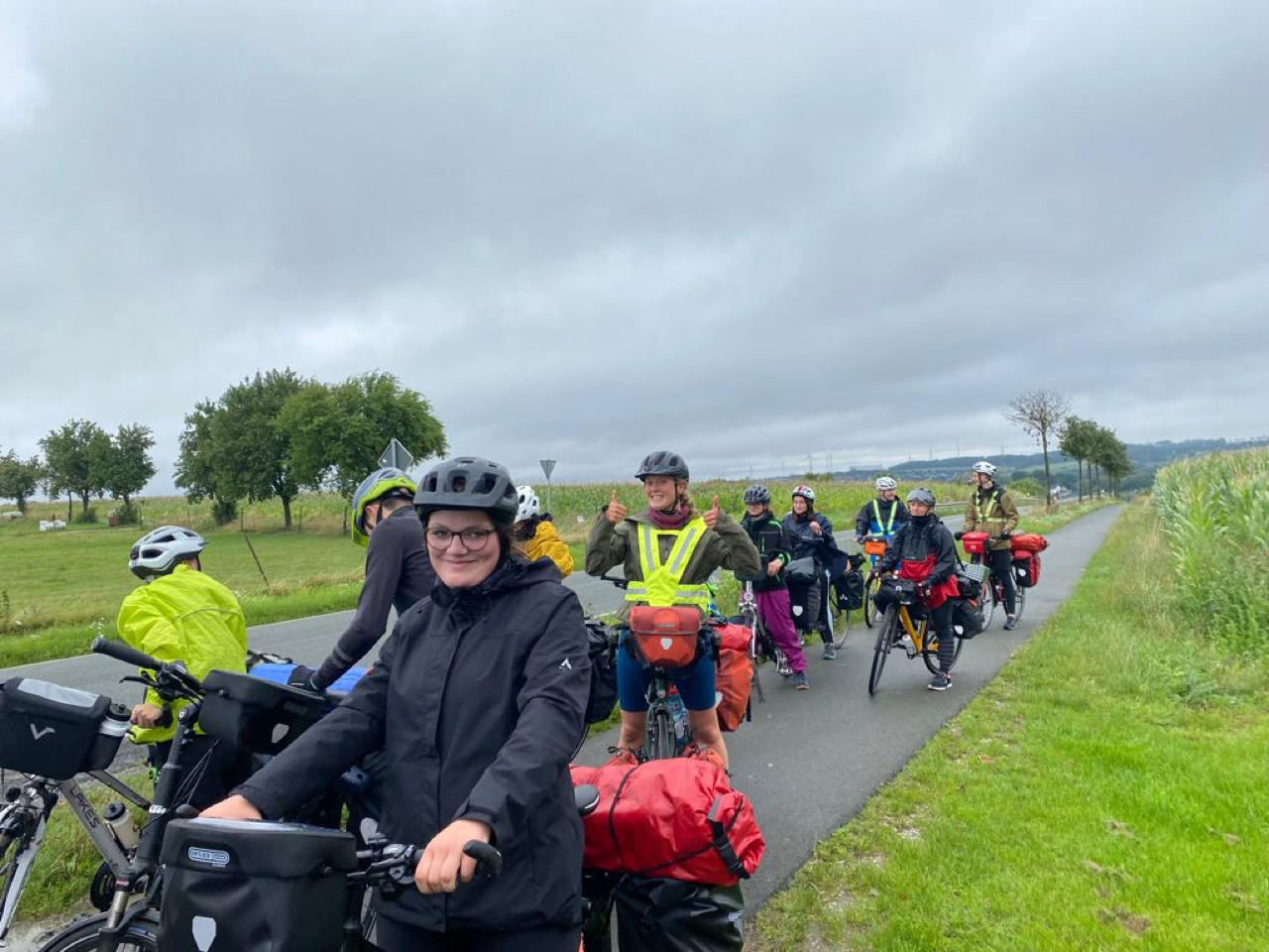 Tag 1: Endlich auf Tour! Mit Jubel und Applaus wurden wir auf die Fahrt verabschiedet. Starke Schauer und Gegenwind im Wechsel mit kurzem Sonnenschein waren unsere Begleitung für die erste Etappe. Nach ca. 60 km kamen wir an der Waldorfschule Soest an. In der Sporthalle liegen und hängen nun Matten, Schlafsäcke, eine Menge Fahrrad- und Campingequipment und Hängematten. Vor dem Abendessen ging es für ein paar von uns schwimmen in dem sehr angenehmen "Aqua-Bad" in Soest. Zum Abendessen hatten wir den Luxus, leckeres von einigen Eltern gemachtes und vorbeigebrachtes Chili sin Carne zu essen.