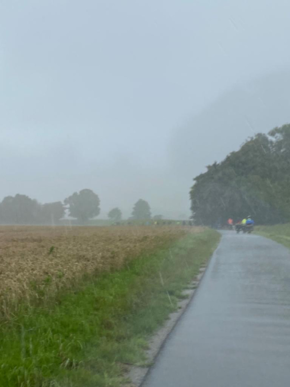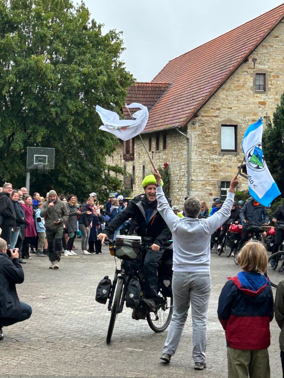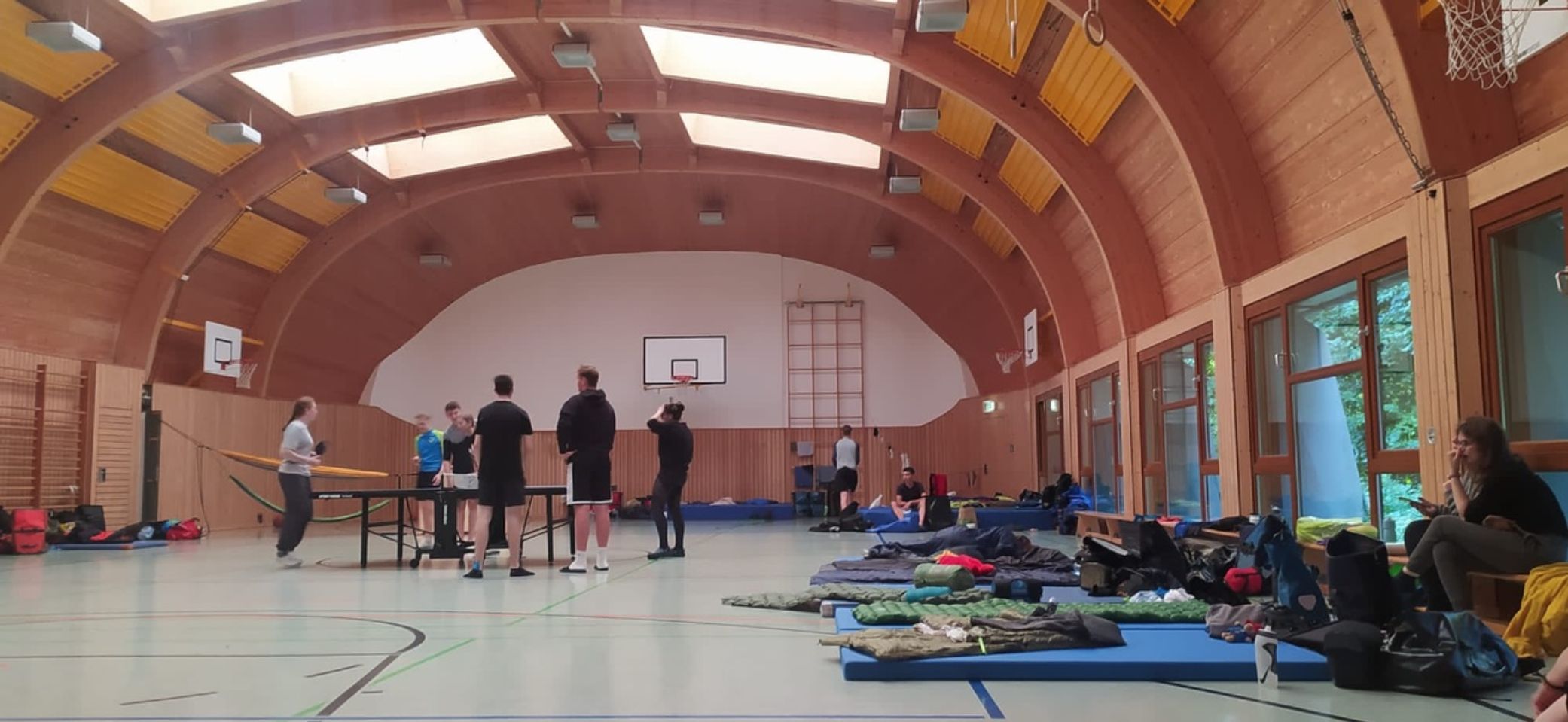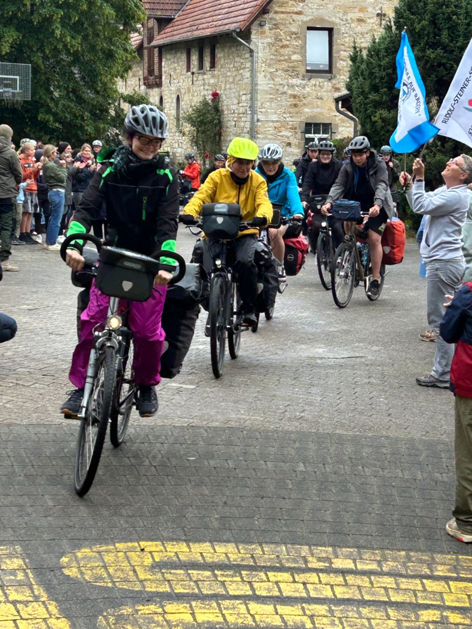 Tag 1: Endlich auf Tour! Mit Jubel und Applaus wurden wir auf die Fahrt verabschiedet. Starke Schauer und Gegenwind im Wechsel mit kurzem Sonnenschein waren unsere Begleitung für die erste Etappe. Nach ca. 60 km kamen wir an der Waldorfschule Soest an. In der Sporthalle liegen und hängen nun Matten, Schlafsäcke, eine Menge Fahrrad- und Campingequipment und Hängematten. Vor dem Abendessen ging es für ein paar von uns schwimmen in dem sehr angenehmen "Aqua-Bad" in Soest. Zum Abendessen hatten wir den Luxus, leckeres von einigen Eltern gemachtes und vorbeigebrachtes Chili sin Carne zu essen.
