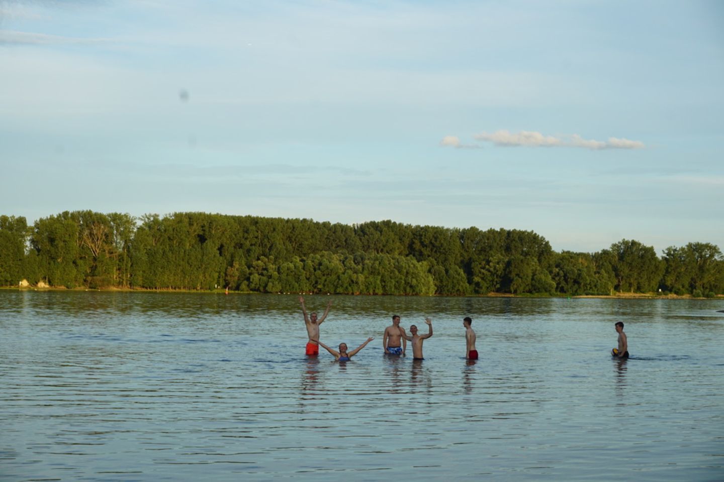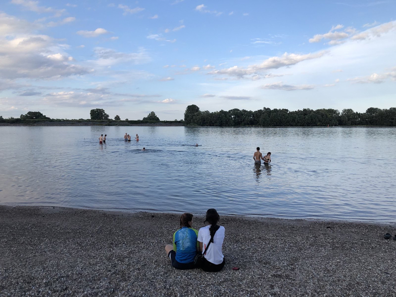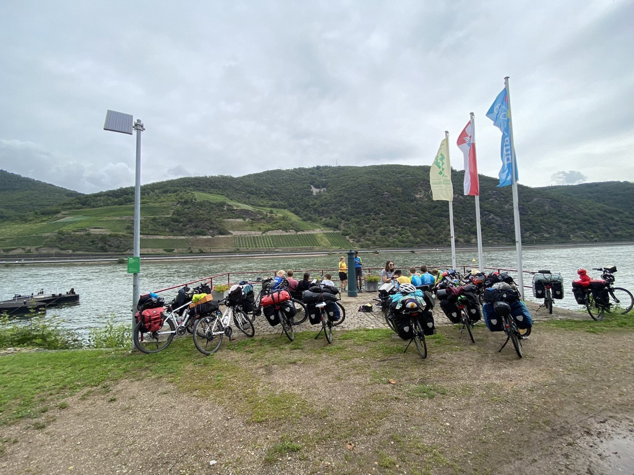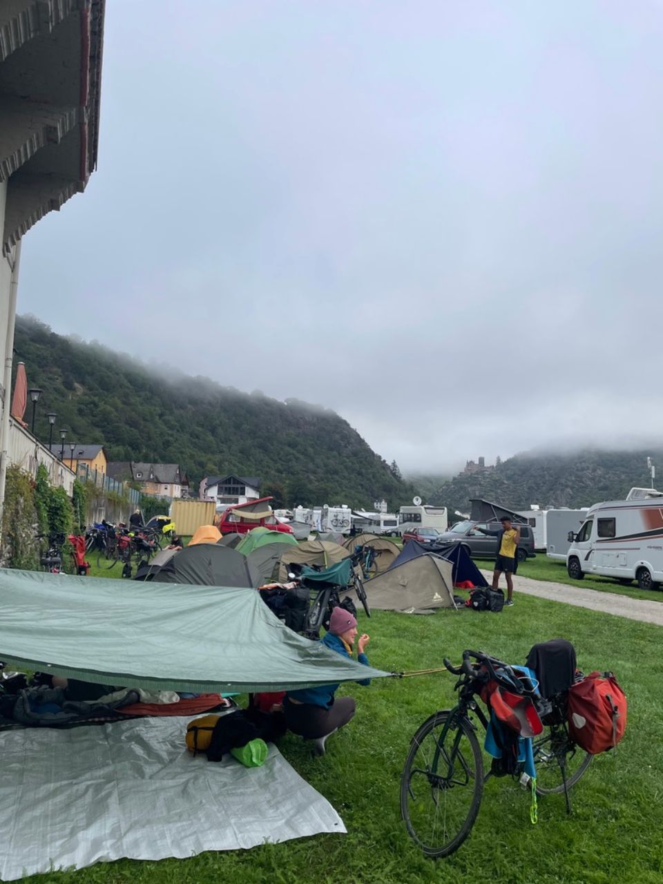 Tag 7: Als wir heute Morgen nach der ersten Campingplatz-Nacht aufstanden, hing der Nebel über den Felsen. Nach dem Frühstück ging es dann von Sankt Goar wieder weiter den Rhein entlang. Relativ schnell fiel auf, dass die erste Woche Radeln ihre Spuren hinterlassen hatte und einige mit ihren Kräften zu kämpfen hatten. So beschlossen wir nach der ersten Pause in zwei Gruppen weiter zu fahren und erst zur Mittagspause in Mainz wieder zusammenzutreffen. Es gab eine schnellere und eine langsamere Gruppe. Damit konnten sich alle gut arrangieren. Bei der Mittagspause erlebten wir wieder einmal gastfreundliche Menschen, bei denen wir unsere Flaschen auffüllen und die Toilette benutzen durften. Den letzten Teil der Strecke fuhren wir (in ruhigem Tempo) wieder gemeinsam, bis wir in Oppenheim, unserem Übernachtungsort ankamen. Auf dem Campingplatz, den wir zuerst angefahren hatten, konnten wir nicht bleiben. Also fuhren fünf Leute los, um weiter zu suchen und der Rest kühlte sich erstmal im Rhein ab. Herr Langrock hatte auf der Suche nach einem Campingplatz einen Kanuclub gesehen und nachgefragt, ob wir dort übernachten könnten. Ja! Also setzten wir uns wieder auf die Räder und fuhren die wenigen Kilometer zum Kanuclub, wo wir uns drinnen sowie draußen einrichteten. Wir können auf einen sportlichen, sehr schönen Tag zurückblicken!