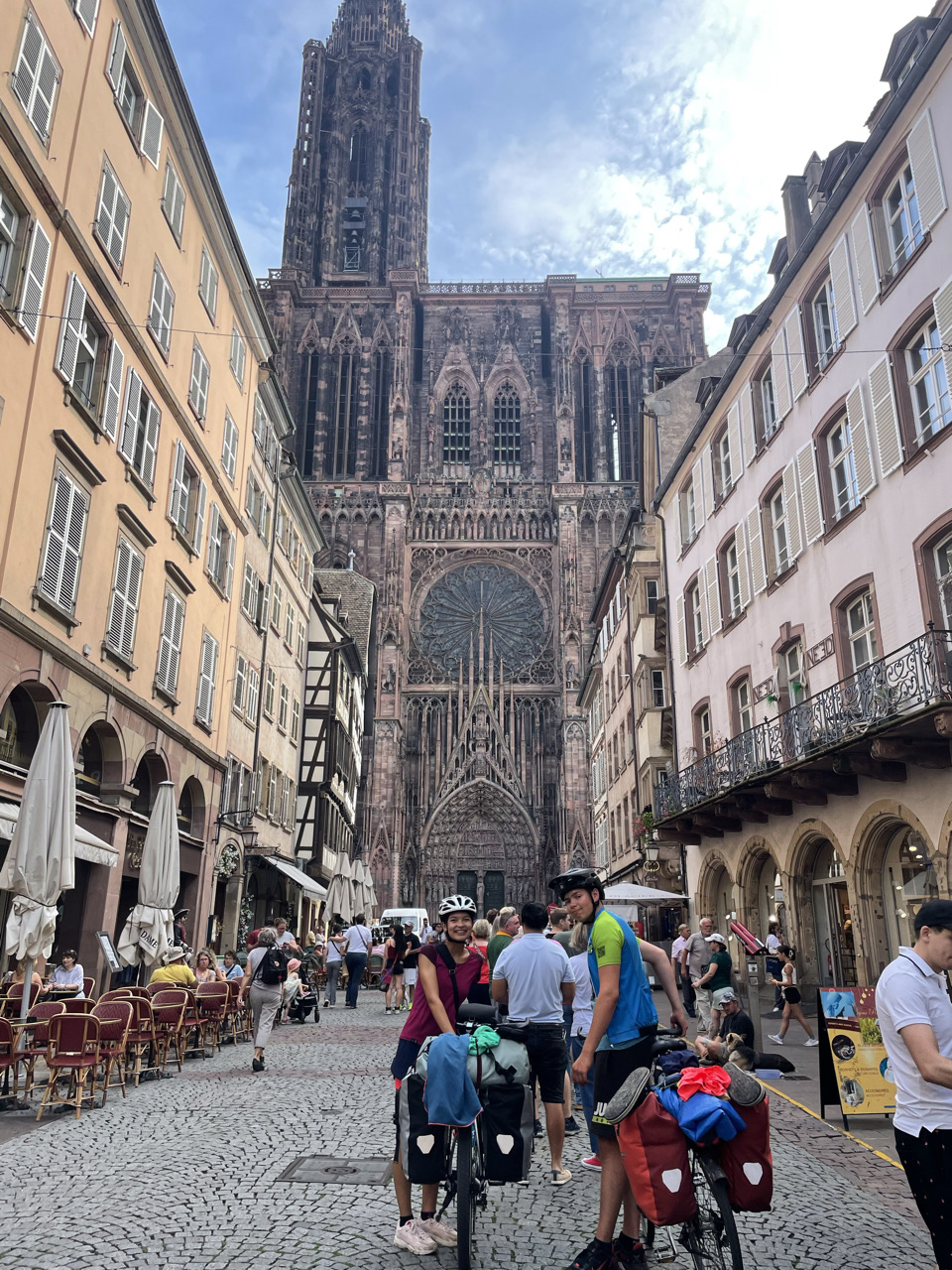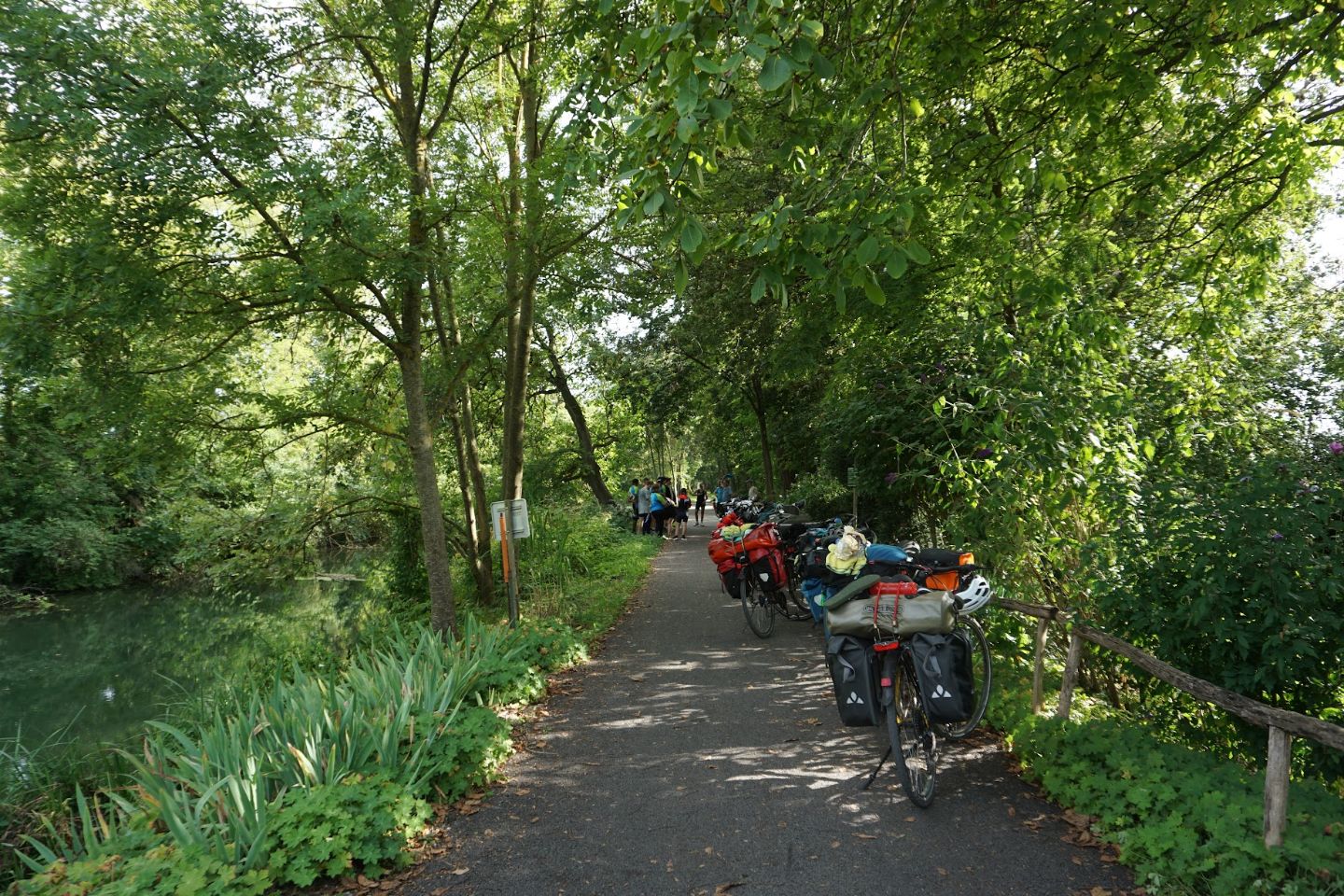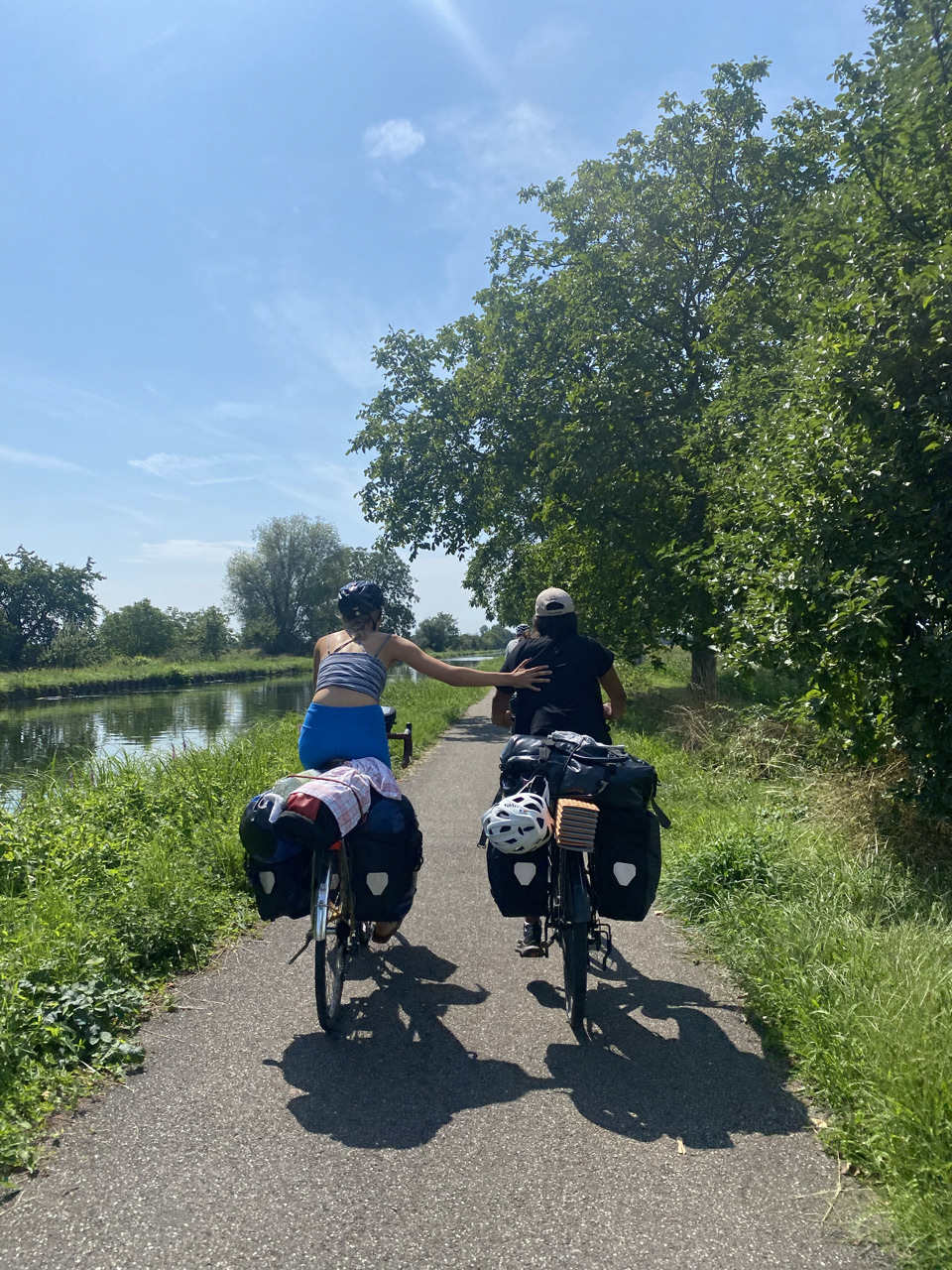 Tag 11: Unser heutiges Ziel war Neuf-Brisach. Wir machten eine ausgiebige Frühstückspause im Stadtzentrum am Dom in Straßburg. Danach ging es los: den ganzen Tag schnurgeradeaus den Rhein-Rhone-Kanal entlang. Die große Hitze machte vielen zu schaffen und so ging es eher gemächlich voran. Die schöne, verkehrsarme Umgebung machte es möglich seinen Gedanken nachzuhängen und ein bisschen "in den flow" zu kommen. Zwei Mitschüler*innen wurden unterwegs von Frau Majewski mit dem Begleitfahrzeug aufgesammelt, da sie krank bzw. verletzt waren. Wie gut, dass wir so eine tolle Unterstützerin dabei haben! Die Mittagspause verbrachten wir auf einer Wiese mit einem großen Bienenstock in der Nähe. Nun haben wir unsere Zelte, Hängematten und Planen an einem großen Campingplatz in Neuf-Brisach aufgebaut und werden gleich das Abendessen kochen.