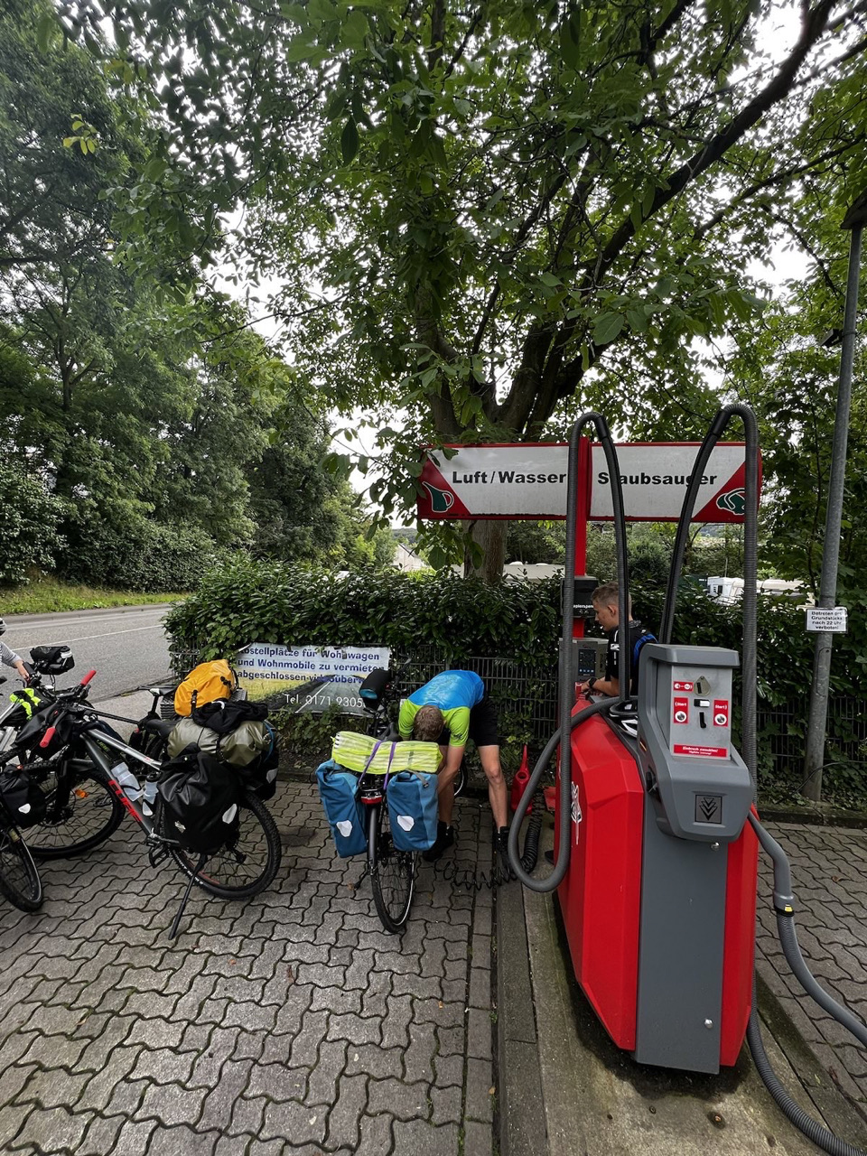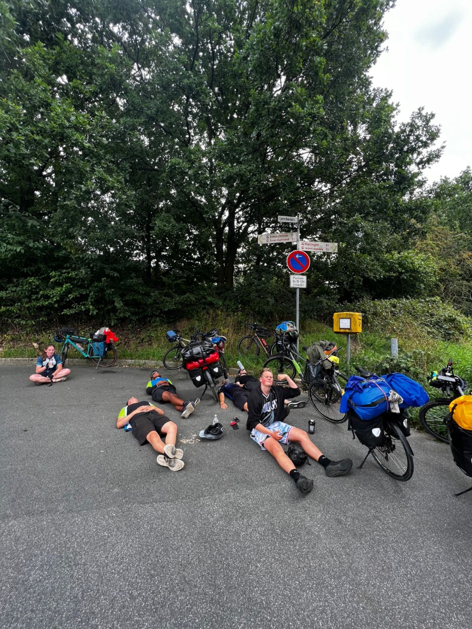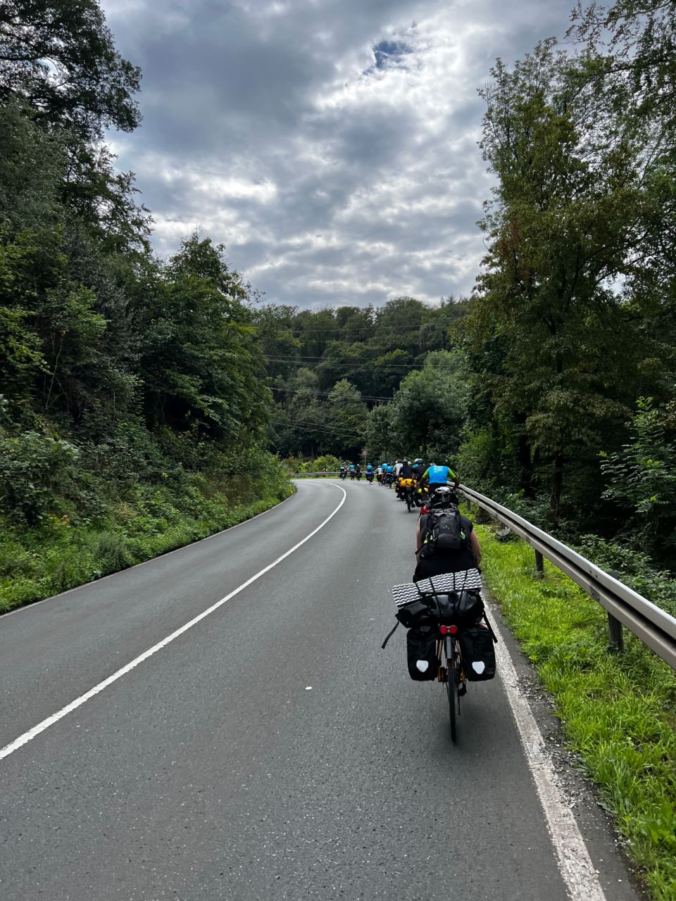 Tag 3: Heute morgen war es zwar sehr frisch, aber zum ersten Mal startete ein Tag mit Sonne und blauem Himmel. Wir haben im Institut gefrühstückt. Dabei wurde das Geburtstagskind Johanna mit einem Ständchen von den Studenten überrascht. Das Tagesziel war ein Pfarrheim in Lohausen, dem Norden von Düsseldorf. Dafür wollten wir eigentlich einen Großteil der Strecke an der Ruhr entlang fahren. Im Laufe des Tages zeigte sich jedoch, dass der Ruhrradweg großflächig überschwemmt war. Die Alternative war querbeet. So ist es zur ersten richtigen Kraftprobe in Form eines sehr steilen und langen Bergs gekommen. Außerdem machten wir unterwegs viele Stopps wegen kleinen Pannen, zu großen Lücken in der Gruppe, Pipipausen und Vielem mehr. So war es ein langer, anstrengender Tag. Die Belohnung war eine ehemalige Bahnstrecke, heute eine kilometerlange geteerte Abfahrt, die uns allen die Laune wieder gehoben hat. In Lohausen wurden wir sehr nett empfangen und durften das Gemeindehaus beziehen. Wir wurden vom Pastoren sogar zu Pizza eingeladen. Vielen Dank für die Gastfreundschaft! Am Abend saßen wir noch bis spät zusammen, um in einem Krisengespräch über die Herausforderungen der Fahrt zu sprechen und darüber, ob wir diese als Gruppe bewältigen können.