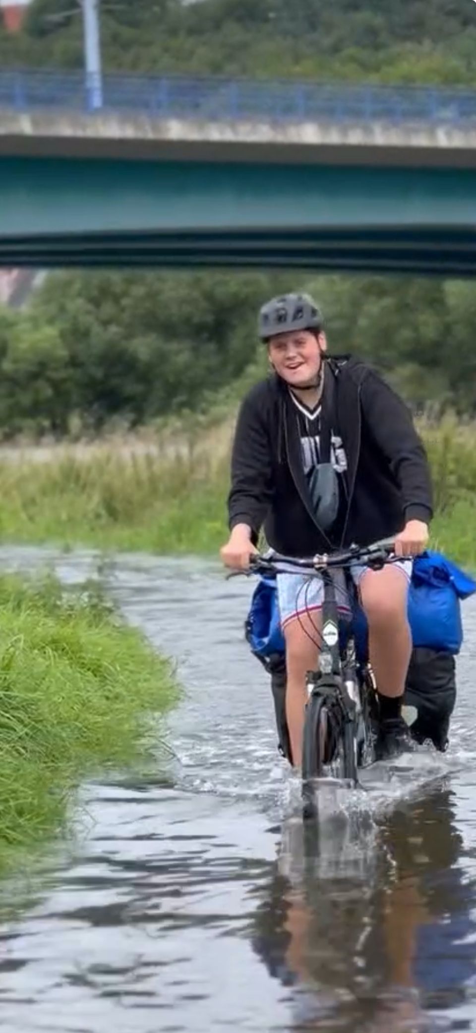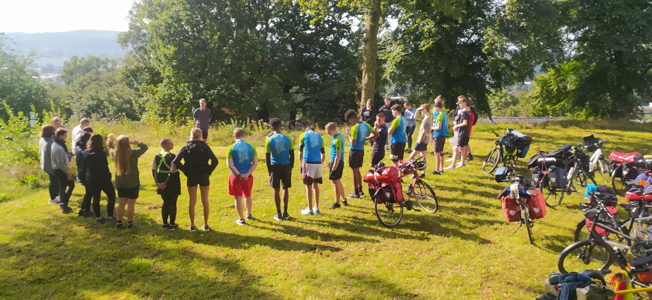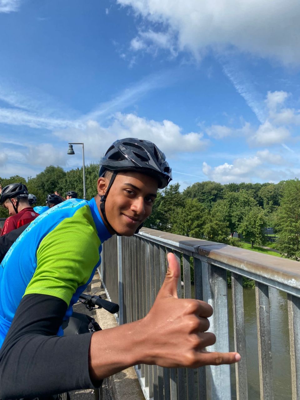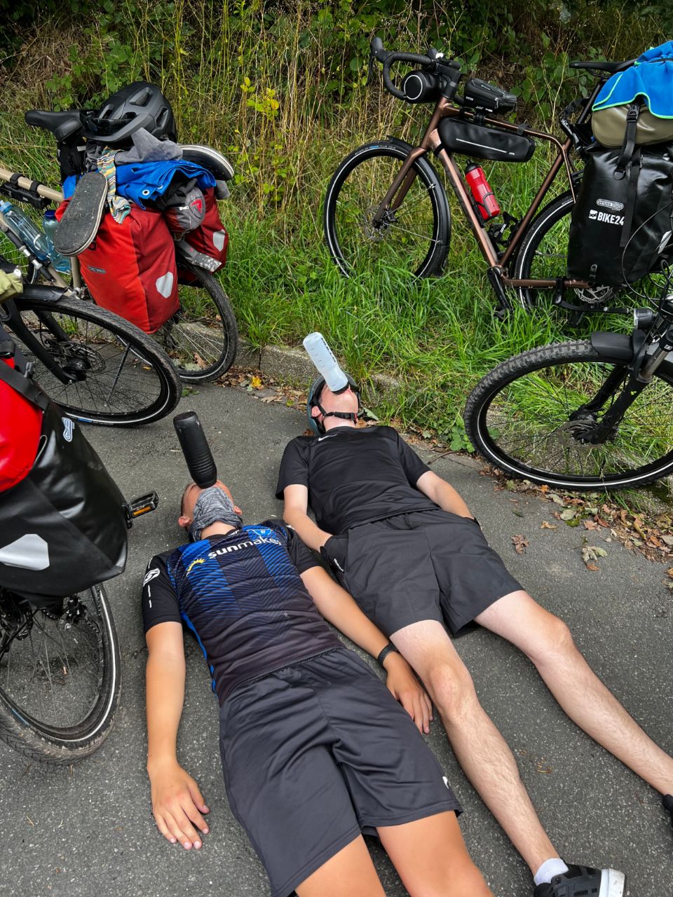 Tag 3: Heute morgen war es zwar sehr frisch, aber zum ersten Mal startete ein Tag mit Sonne und blauem Himmel. Wir haben im Institut gefrühstückt. Dabei wurde das Geburtstagskind Johanna mit einem Ständchen von den Studenten überrascht. Das Tagesziel war ein Pfarrheim in Lohausen, dem Norden von Düsseldorf. Dafür wollten wir eigentlich einen Großteil der Strecke an der Ruhr entlang fahren. Im Laufe des Tages zeigte sich jedoch, dass der Ruhrradweg großflächig überschwemmt war. Die Alternative war querbeet. So ist es zur ersten richtigen Kraftprobe in Form eines sehr steilen und langen Bergs gekommen. Außerdem machten wir unterwegs viele Stopps wegen kleinen Pannen, zu großen Lücken in der Gruppe, Pipipausen und Vielem mehr. So war es ein langer, anstrengender Tag. Die Belohnung war eine ehemalige Bahnstrecke, heute eine kilometerlange geteerte Abfahrt, die uns allen die Laune wieder gehoben hat. In Lohausen wurden wir sehr nett empfangen und durften das Gemeindehaus beziehen. Wir wurden vom Pastoren sogar zu Pizza eingeladen. Vielen Dank für die Gastfreundschaft! Am Abend saßen wir noch bis spät zusammen, um in einem Krisengespräch über die Herausforderungen der Fahrt zu sprechen und darüber, ob wir diese als Gruppe bewältigen können.